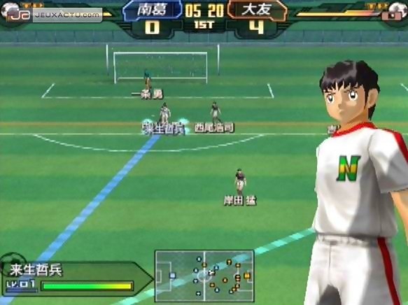 Reste enfin un jeu simplifié à l’extrême dans ses à-côtés : les coups de pieds arrêtés sont tirés automatiquement, un unique tacle est disponible pour engager le contact, et ne cherchez pas la faute, il n’y a pas d’arbitre de toutes façons. Tout ceci afin de maintenir une fluidité et que l’action ne tombe pas, ce qui s’avère pourtant immanquablement le cas avant chaque passe/centre/tir. Ce constat est d’ailleurs aggravé en mode deux joueurs, dans lequel la vue bascule vers un jeu de football classique afin de ne pas séparer l’écran en deux. De même on ne dirige pas qu’un seul joueur, mais l’ensemble de l’équipe, donc en mode deux joueurs Captain Tsubasa à le postérieur entre deux tabourets et aurait peut être du devenir un jeu de foot classique, en conservant simplement son système de défis. En effet, dans le cadre d’un jeu à deux, le fait que l’action soit stoppée à la moindre passe devient rapidement un tue-l’amour ludique en puissance, et la frénésie des événements scéniques ne parvient plus à nous détourner de l’ennui et de la frustration. Techniquement, pour ne pas déroger à la tradition des adaptations d’anime de Bandai Namco Games, le jeu est bien évidemment hideux, encore que étant donné le côté sommaire du graphisme original de Yôichi Takahashi, on pourrait presque parler de fidélité esthétique. On reconnaît d’ailleurs sans peine Olivier Atton, Marc Landers, Ben Becker, ou encore les frères Derrick (les patronymes français, c’est juste pour emmerder les puristes) et c’est probablement le principal. Dommage quand même que la réalisation soit naze au point de se mettre à ramer de temps en temps.