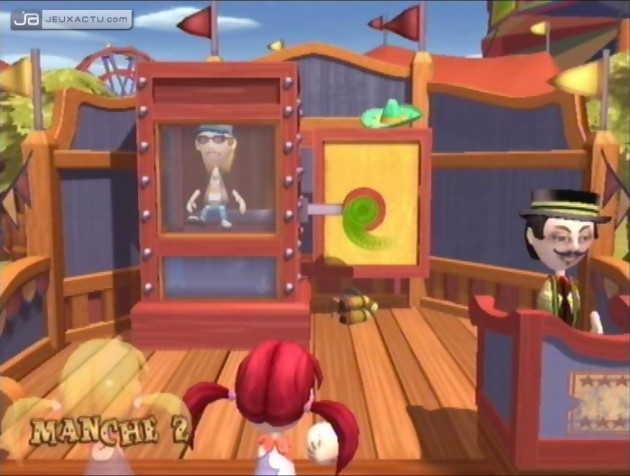 Afin de ne pas mélanger torchons et chiffons, Take Two Interactive a eu la brillante idée de créer un nouveau label pour les jeux casual qu’il éditera à l’avenir. C’est donc dans cette optique qu’est né 2K Play dont le premier bébé n’est autre que ce Carnival : Fête Foraine qui tombe à point nommé pour se glisser dans la hotte du Père-Noël. Le design, la surcharge de couleurs chatoyantes et l’accroche "plus de 25 jeux" de la jaquette cible donc le grand public. A l’instar de Wii Sports ou plus récemment de Mario Party 8, Carnival Games est un melting pot des différentes activités que l’on peut pratiquer lorsqu’on traîne ses guêtres du côté de la Foire du Trône les soirs de mois de mai moroses. S’il est évidemment conseillé de jouer à plusieurs pour tirer partir des qualités ludiques du jeu, Carnival : Fête Foraine a également pensé aux joueurs solitaires et propose donc un mode solo, baptisé "Prix". Celui-ci permet notamment de débloquer des tickets, des tenues, des accessoires et autres bonus pour rallonger faussement la durée de vie du jeu. Car il faut bien reconnaître que malgré la présence de 25 mini-jeux, on fait rapidement le tour de Carnival : Fête Foraine, faute d’épreuves bien intéressantes. A l’exception faite d’une poignée de défis tels que Hue Dada, Nerf d’acier, Splash ou Plouf, le clown (vous noterez la pertinence du nom des mini-jeux), le reste des épreuves manquent sérieusement de challenge et surtout de fun pour espérer attirer l’attention des joueurs, aussi casual soient-ils. Mais, c’est avant tout l’imprécision de la Wiimote qui fait cruellement défaut au jeu. Inutile d’aller vérifier la configuration de sa manette, le problème se situe véritablement dans le jeu, où il faut parfois agiter la zappette comme un malade mental pour espérer envoyer une balle à quelques mètres devant soi. A cela s’ajoute un habillage qui manque singulièrement d’inspiration et qui démontre bien que ce jeu a été développé en l’espace de quelques six mois, à tout casser. Reste alors la personnalisation de son avatar en début de jeu, mais à quoi bon quand on sait que ce dernier apparaît les trois-quarts du temps en transparence et de dos ?
