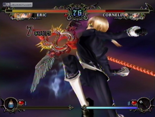 Castlevania Judgment ne fait évidemment pas le poids face aux cadors habituels du genre (Soul Calibur, Virtua Fighter, Tekken), même en mettant toute sa santé pour reprendre leurs meilleures idées. On pense notamment aux armes blanches piquées à la légende qui ne meurt jamais de Bandai Namco Games, un choix qu'on comprend aisément puisque les fouets, épées, glaives et autres lances n'ont jamais manqué dans la série. En fait, c'est la balance des coups qui se révèle problématique, ce qui empêche d'obtenir des combats à peu près équilibrés. Il ne faut pas passer dix nuits blanches sur Castlevania Judgment pour se rendre compte que Death, aussi féroce au corps à corps qu'à distance, fait partie des personnages crackés du jeu ; au même titre qu'Eric Lecarde qui est capable de claquer des combos nucléaires. De quoi écoeurer ceux qui cherchent désespérément la faille dans le jeu adverse. S'il est toujours jubilatoire de morfler pendant cette phase d'apprentissage où l'on apprend à connaître les forces et les faiblesses de chacun des combattants, pour mieux les punir après, force est de constater que Castlevania Judgment n'offre aucune marge de progression. Du coup, les combats tournent rapidement au règlement de compte entre Lecarde et Death, les autres acteurs du casting étant priés d'aller s'amuser dans le bac à sable. On pourra toujours gratter un match ou deux avec Sypha Belnades, mais enchaîner les défaites sans avoir la possibilité de se rebeller vient à bout de tout, même d'une volonté de fer. La prise en main de Castlevania Judgment avec la Wiimote et le Nunchuk n'arrange pas vraiment les choses, et démontre encore une fois qu'il ne faut pas compter sur une précision extrême de la part des deux appendices de la console lorsqu'elles ne sont pas domptées par Nintendo. Secouer la télécommande d'un mouvement sec permet de sortir une attaque classique, alors qu'il faudra insister sur le mouvement pour exécuter un combo. Avec un tel système, inutile d'espérer varier ses coups puisque la reconnaissance de mouvements ne prend pas en compte l'angle et la vitesse du geste. On se retrouve dès lors avec un rythme monotone et des attaques archi-prévisibles. Le cocktail parfait pour ruiner un jeu de combat.