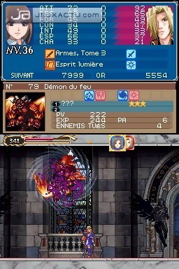 Si Konami s'est misérablement planté sur le switch, il a par contre su développer parfaitement cet aspect RPG que Castlevania : Symphony of the Night fut le premier à soumettre à la saga. On se retrouve donc avec des persos dont le level augmente en multipliant les combats, et qui peuvent s'équiper de différents éléments afin d'améliorer leurs caractéristiques. Puissance, défense, intelligence, attaque, on a droit aux critères traditionnels d'un RPG, sans oublier le statut qui renvoit à l'état de forme du personnage. Doté chacun d'une attaque de base via Y, ils peuvent aussi faire appel à une attaque secondaire préalablement configurée. Portrait of Ruin propose une bonne dose d'action avec des monstres aux attaques redoutables, c'est vrai, mais il incite également à l'exploration des niveaux pour dénicher tous les bonus et items qu'il regorge. Il arrive donc que l'on revienne dans un stage déjà exploré, en jetant régulièrement un coup d'oeil sur la map pour être certain de ne pas rater une pièce. Les niveaux ne sont pas particulièrement vastes, mais la multiplication des petites salles rend parfois l'exploration redondante. C'est pour éviter au maximum ces allers-retours soporifiques que des points de téléportation ont été mis à la disposition du joueur. Une fois le personnage placé dessus, il suffit d'appuyer en haut de la croix pour sélectionner ensuite un autre point de téléportation qui figure sur la map. Ils sont désignés par un carré bleu, et jouxtent généralement les points de sauvegarde. Ces derniers permettent d'ailleurs de blinder sa barre de PV si elle est dans le rouge, un bon moyen de ne pas gratter sur les items régénérateurs que l'on a dans sa besace. Car même si Portrait of Ruin n'est pas aussi sévère que Castlevania sur NES, il ne permet pas pour autant d'acheter une quarantaine de potions au marchand. Le stock se limite à une dizaine d'unités par produit, et il faut donc se mettre à la recherche de millefeuilles et autres crèmes glacées pour bénéficier de bonus supplémentaires.
