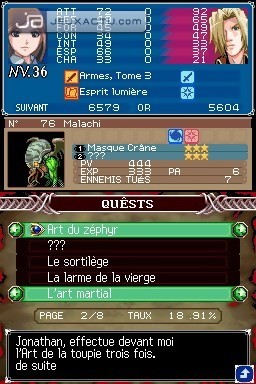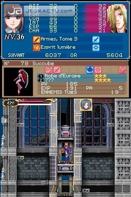 Si Konami s'est misérablement planté sur le switch, il a par contre su développer parfaitement cet aspect RPG que Castlevania : Symphony of the Night fut le premier à soumettre à la saga. On se retrouve donc avec des persos dont le level augmente en multipliant les combats, et qui peuvent s'équiper de différents éléments afin d'améliorer leurs caractéristiques. Puissance, défense, intelligence, attaque, on a droit aux critères traditionnels d'un RPG, sans oublier le statut qui renvoit à l'état de forme du personnage. Doté chacun d'une attaque de base via Y, ils peuvent aussi faire appel à une attaque secondaire préalablement configurée. Portrait of Ruin propose une bonne dose d'action avec des monstres aux attaques redoutables, c'est vrai, mais il incite également à l'exploration des niveaux pour dénicher tous les bonus et items qu'il regorge. Il arrive donc que l'on revienne dans un stage déjà exploré, en jetant régulièrement un coup d'oeil sur la map pour être certain de ne pas rater une pièce. Les niveaux ne sont pas particulièrement vastes, mais la multiplication des petites salles rend parfois l'exploration redondante. C'est pour éviter au maximum ces allers-retours soporifiques que des points de téléportation ont été mis à la disposition du joueur. Une fois le personnage placé dessus, il suffit d'appuyer en haut de la croix pour sélectionner ensuite un autre point de téléportation qui figure sur la map. Ils sont désignés par un carré bleu, et jouxtent généralement les points de sauvegarde. Ces derniers permettent d'ailleurs de blinder sa barre de PV si elle est dans le rouge, un bon moyen de ne pas gratter sur les items régénérateurs que l'on a dans sa besace. Car même si Portrait of Ruin n'est pas aussi sévère que Castlevania sur NES, il ne permet pas pour autant d'acheter une quarantaine de potions au marchand. Le stock se limite à une dizaine d'unités par produit, et il faut donc se mettre à la recherche de millefeuilles et autres crèmes glacées pour bénéficier de bonus supplémentaires.