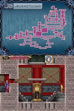 Afin de sortir de l'atmosphère confinée du château, Konami a fait de Brauner un peintre-vampire qui a dispatché dans la demeure de Dracula quatre toiles maléfiques. Au bout d'environ cinq heures de jeu, l'affaire est pliée, avec le bad ending comme lot de consolation. Si vous voulez du rab, il va falloir torcher quatre autres peintures qui ne sont en fait qu'un remix des précédentes, ponctuées par la présence d'un nouveau boss. Tissé à partir d'une 2D qui a déjà fait ses preuves dans Dawn of Sorrow, Castlevania : Portrait of Ruin s'applique à user et abuser de détails qui séduisent la rétine. Il nous fait visiter l'Egypte ancienne, une cité perdue, et même une maison de fous. Le level design de cette dernière se démarque par le fait que vous évoluez dans un monde où les décors sont à l'envers. Pas vraiment perturbant car on n'y fait pas très attention, mais on ne peut que saluer l'originalité de l'initiative. S'il est évident que la 3D occupe une place plus importante dans ce nouvel opus, notamment au niveau du background et du scrolling différentiel, quelques animations plus subtiles sont également plaisantes à voir. On pense particulièrement à la dégaine des servantes armées de leur "aspirateur tête de mort", ou bien les jeunes filles sagement assises sur leur chaise et qui se muent subitement en amazone dès que vous les approchez. Malgré la taille réduite des sprites, on arrive tout de même à distinguer les mouvements des persos qui ne se confondent pas dans un amas de pixels. On pourra néanmoins reprocher aux graphistes d'avoir pompé certains monstres dans les opus précédents, ce qui donne une impression de patchwork dans certains passages du jeu. Déception également pour les pouvoirs magiques qui ne brisent pas vraiment les yeux, même s'ils sont de bonne facture. Castlevania : Portrait of Ruin impose grosso modo une dizaine d'heures de jeu avant de pouvoir sortir le stylet de son encoche. Avec deux nouveaux personnages principaux aux manettes qu'on vous laisse le soin de découvrir, les combats sont donc entièrement gérés au stylet dans ce mode bonus. Pour les gauchers de naissance, aucune option inversée ne semble disponible, il faut donc faire avec et manier le stylet avec la main droite. Cela dit, une précision hautement chirurgicale n'est pas vraiment nécéssaire pour rayer les ennemis de la carte.