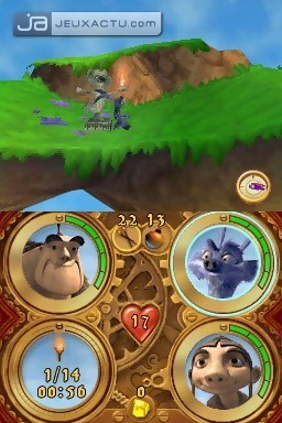 "Zoé est une petite fille qui croit aux légendes, pas parce qu'elle est naïve mais parce les légendes, elle aime ça. Afin d'aider son oncle le Seigneur Arnold à se débarrasser d'un terrible dragon, Zoé se met en tête de trouver des héros. Et quand elle tombe sur Gwizdo et Lian-Chu - deux chasseurs de dragon à la petite semaine - et bien tant pis, Zoé décide d'y croire quand même !" Ce pitch récupéré sur le communiqué de presse du film sert aussi de trame à l’adaptation en jeu vidéo de Chasseurs de Dragons, dans le sens où le jeu nous invite à prendre les commandes de notre trio de héros atypiques. La particularité de Chasseurs de Dragons réside dans la possibilité de contrôler à tour de rôle - et comme bon nous semble, en touchant l’icône correspondante via l’écran tactile - les trois protagonistes mis à notre disposition. Bien évidemment, chacun de ces personnages dispose de caractéristiques bien distinctes, vous l’aurez décelé. Gwizdo, grâce à sa silhouette chétive, est plutôt rapide et sa spécialité est de pouvoir réaliser des sauts de grande ampleur. Mieux, en appuyant deux fois sur la touche de saut, il est capable d’exécuter un double saut. Lian-Chu à l’inverse possède une forte corpulence qui le prive des performances de son camarade svelte. En revanche, il peut compter sur sa force brute pour asséner des coups puissants, mais aussi utiliser ses armes pour tuer les ennemis à distance. Reste alors Hector, animal de poils qui possède la faculté de se mettre en boule pour ainsi passer dans des passages à première vue inaccessibles. Il peut également se cacher dans des endroits indiqués sur la carte, afin d’échapper à des pièges fumeux. Jusque-là, rien de bien exceptionnel, Chasseurs de Dragons s’inscrit dans la lignée des jeux de plates-formes classiques qui pullulent sur DS. Et c’est bien là son grand problème, à savoir nous proposer un gameplay ultra classique et beaucoup trop linéaire pour qu’on s’y attarde plus longuement. A la rigueur, la seule originalité du titre réside dans le système de planètes avec centre de gravité et qui permet de se balader la tête en bas, un peu de la même manière qu'un certain Super Mario Galaxy. Si les graphismes restent satisfaisants pour un titre 3D sur DS, les environnements sont pauvres et manquent singulièrement de charme pour attirer notre attention. Le concept de scrolling horizontal renvoie aux vieux titres des années 80, l’effort est saluable, mais à aucun moment Chasseurs de Dragons parvient à se démarquer des autres productions du genre. Ajoutons à cela des actions répétitives, ultra molles et pour la plupart du temps sans intérêt et vous saurez à quoi vous en tenir.