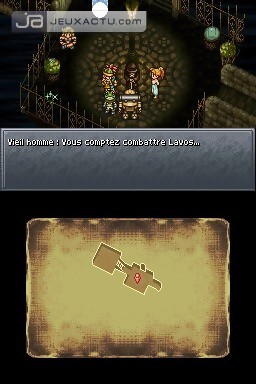A contre-courant de sa politique actuelle, Square Enix n’a pas offert de refonte graphique à Chrono Trigger. Un moindre mal pour quiconque aura connu l’œuvre d’origine, mais qui pourrait pousser certains joueurs peu habitués à la 2D, aussi belle soit-elle, à faire l’impasse sur le titre. Un manque d’ouverture forcément dommageable, d’autant que quelques efforts ont été apportés à l’interface afin de la rendre plus lisible. En ce sens, le mode DS, par opposition au mode "Classique", proposé en début de partie fait presque figure d’incontournable si l’on veut profiter de manière optimale des combats. La totalité des fenêtres et informations étant en effet déplacées sur l’écran tactile pour faciliter la navigation. Certes, les menus ne ressemblent pas trait pour trait à ceux d’origine, mais ils ont le mérite d’enlever un point négatif tout trouvé pour certains. Pour finir, impossible de faire l’impasse sur les ajouts à proprement parlé de cette version DS. Toujours à prendre pour ce qu’ils sont, c'est-à-dire des extras, ils oscillent, il fallait s’y attendre, entre le sympathique et le totalement anecdotique. Et comme souvent, c’est certainement ce qui aura demandé le plus de travail aux développeurs qui se révèlera le moins mémorable. En effet, si l’on appréciera de pouvoir visionner à l’envie artworks et autres scènes animées débloquées durant l’aventure, celles-là mêmes qui agrémentent la version PSone, on peine franchement à croire que les joueurs seront nombreux à se ruer sur le mini-jeu de combat de monstres. Compatibilité Wi-Fi ou non. Mis à part quelques changements de noms qui froisseront les anciens ayant connu une quelconque version américaine, la traduction se montre, pour sa part, à la hauteur de l’évènement. Un strict minimum.