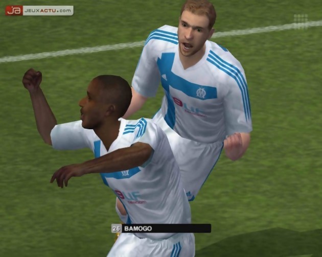 Par bonheur, la version que nous avons pu tester était la version estampillée Olympique de Marseille. S’il avait fallu tester la version PSG, je ne vous aurais pas garanti la totale impartialité de ce test. Tout commence par un petit clip plutôt sympathique, où l’on voit des images de la ville, du stade, des supporteurs et des stadiers qui font la fête tous ensemble (sûrement après un but de Drogba la saison dernière). Ensuite, on se retrouve sur une page d’accueil aux couleurs du club (ici l’OM donc), avec un joueur, choisi aléatoirement dans l’effectif, qui jongle maladroitement à côté des menus. Outre le mode Exhibition, qui vous permet de faire des matchs amicaux avec n’importe quelle équipe, tout l’intérêt, aussi minime soit-il, réside dans le mode « Menu Club ». Vous aurez ici le choix de participer au championnat national ou au trophée européen, sorte de mini ligue des champions avec deux groupes de six équipes, où les deux premiers de chaque groupe se retrouvent en demi finale.