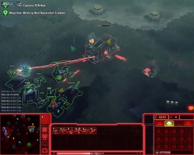 Mais la plus grosse révolution provient de la refonte totale du gameplay, tellement extrême qu'elle en détruit même les fondations de la stratégie temps réel. Ainsi, le Tiberium n'a plus qu'un rôle symbolique puisqu'il n'y a pour ainsi dire plus aucune phase de récolte de ressources ! Terminées les exploitations de gisements, il faut se contenter de quelques cristaux uniques (quatre ou cinq par map) à ramasser manuellement avec n'importe quelle unité de passage et à ramener à la "base" (nous verrons que les guillemets ont leur importance) pour obtenir un malheureux point d'upgrade. Malgré la réapparition régulière des cristaux, il est impossible d'automatiser la tâche. On se contente donc d'en ramasser deux ou trois à chaque partie afin de débloquer les technologies les plus importantes, puis on les oublie. Il faut dire aussi que les unités ne coûtent désormais plus rien. La seule limitation est celle du nombre de points de commandement. Une fois cette limite atteinte, on ne peut plus engager aucun soldat ou véhicule supplémentaire. Mais dès que l'on perd une unité, un clic suffit pour en créer une nouvelle. L'aspect économique n'est pas le seul à être passé à la trappe puisqu'il n'est plus question non plus de construire des bâtiments de productions. La "base" (avec des guillemets, donc) se limite à une seule unité géante : le Crawler. Ce véhicule mobile de septième génération ne peut être installé qu'en certains points précis de la map, que l'on peut capturer pour étendre les possibilités de déploiement et limiter celles de l'ennemi. Sa perte n'est même pas synonyme de défaite puisqu'on peut en appeler plusieurs dans une même partie (mais jamais deux en même temps). On se voit d'ailleurs parfois obligé de suicider son Crawler afin d'en invoquer un autre, mieux adapté à la situation en cours. Il existe en effet trois types de Crawler : l'offensif qui donne accès aux unités les plus puissantes, le défensif qui privilégie les unités de soin et permet de construire tourelles et bunkers, et le MCV de support qui autorise l'utilisation de pouvoirs de zone (réparation, affaiblissement, renforcement...). Les développeurs semblent penser que les joueurs modernes ne sont plus capables de gérer plusieurs aspects de gameplay à la fois. D'ailleurs, on remarquera que la campagne solo du GDI peut se boucler en mode normal sans jamais réellement faire preuve de réflexion. La méthode consistant à commander le Crawler offensif, à créer deux unités de chaque type et à les envoyer  nettoyer chaque objectif l'un après l'autre suffit à sortir vainqueur à chaque fois. Seule la campagne du NOD (plus courte car amputée des trois missions de didacticiel) nous demande en de rares occasions de gérer plusieurs fronts à la fois. Les amateurs d'action qui ne veulent pas se prendre la tête apprécieront. Les vrais stratèges resteront nettement plus perplexes.