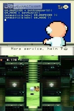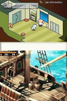Contact est au RPG ce que Killer7 est au jeu d’action. Particulièrement dans le sens où il est en complet décalage avec ses contemporains. A ce titre, on peut vous annoncer d’emblée qu’il ne conviendra pas à tout le monde. En effet, Contact impose un rythme particulier par un triolisme étonnant : le professeur, siégeant dans l’écran supérieur et qui vous donnera mille et un conseils pour l’accomplissement de votre mission ; le héro, véritable acteur de l’aventure et le joueur proprement dit. Ainsi, le professeur tentera d’instaurer un dialogue privilégié avec le joueur par l’intermédiaire de la DS. Malheureusement, la glace se brise trop difficilement pour faire des étincelles mais on salue tout de même cette initiative. Traqué par une mystérieuse organisation extraterrestre nommée Mutestant, le professeur se crashe sur notre planète où il fait la rencontre d’un jeune garçon muet, Terry. Très rapidement, il le charge de récupérer les 6 éléments disséminés un peu partout dans le monde. Convoités par Mutestant pour permettre l’élaboration d’une arme de destruction massive, ces éléments permettront au professeur de réparer son vaisseau spatial. Transformé en galion pour l’occasion, ce dernier vous offrira la possibilité de voyager d’île en île (huit en tout) pour parfaire votre mission. Une aventure malheureusement limitée par le temps puisqu’on peut compter un peu plus d’une dizaine d’heures à peine pour boucler le jeu. Le système de progression est très classique et se limite à : « village-donjon-boss, on recommence et c’est gagné ». De nombreuses quêtes annexes sont pourtant de la partie mais elles apportent trop peu pour que l’on daigne y prêter attention. Derrière tout cela, le jeu se pose avec une remarquable simplicité et un naturel déconcertant. Si Terry doit en quelque sorte sauver le monde, on est très loin de ce côté grave et profond, voire pesant des autres jeux de rôles. C’est bien simple, Contact ne se prend pas du tout au sérieux. Bourré d’humour et de situations insolites en tous genres (il faut par exemple prendre un bain chaud pour remonter ses points de vie), le jeu fait également la part belle à de nombreuses références vidéoludiques. Le professeur peste contre les mises à jour de son ordinateur forçant son redémarrage, que l’on devine provenir de Windows Update. Clins d’œil également à Pikmin, Donjons & Dragons, Pong, Ghosts and Goblins, Oblivion, etc. Mieux vaut donc posséder une certaine culture et faire partie de la catégorie des geeks pour en profiter au maximum. Tout cela lui confère un cachet et un charme certain et finit malgré tout à scotcher les doigts du joueur à sa console.