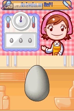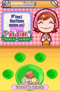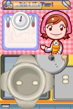 Une simulation de cuisine ? Le concept ou plutôt la recette ne date pas d’hier, du moins au Japon où le genre s’est taillé une belle réputation auprès de la nouvelle génération de joueurs mais surtout de joueuses, cible première de ces jeux au concept bien décalé. Dans Cooking Mama, le joueur endosse donc le tablier d’un jeune apprenti cuisinier qui va apprendre en quelques coups de cuillère à pot à préparer des recettes classiques de la gastronomie japonaise. Soupe Miso, gyozas grillés, curry de porc, Takoyaki, riz aux pousses de bambou, Tonjiru, des plats exotiques auxquels se mêlent des recettes venues de l’Occident tels que le poulet rôti, le steak frites, la pizza, la côtelette de porc ou bien encore les spaghettis à la Napolitaine. Ce n’est pas moins de 120 recettes qui nous attendent au total dans Cooking Mama, des préparations culinaires que l’on découvre au fur et à mesure que l’on réussit les diverses préparations dans le mode "Cuisine". Il va donc falloir se montrer à la hauteur pour pouvoir débloquer l’ensemble des 120 recettes et gagner ses galons de Maïté ou de Cyril Lignac en herbe, c’est vous qui choisissez.