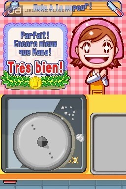 Pour mettre en œuvre tous ces succulentes recettes, seule l’utilisation du stylet suffit amplement. Grâce à lui, on va pouvoir peler une pomme de terre, râper des carottes, émincer des oignons, mélanger un bouillon, faire sauter une poêle, retourner un steak, laver le riz et bien d’autres actions en sus. Les fonctionnalités sont exploitées au mieux et il est même possible de souffler dans le micro de la console pour refroidir une préparation. C’est plutôt bien fait d’autant que les bruitages qui accompagnent la préparation permettent de se prendre pour un cuistot en herbe. Si ce concept fort sympathique convient parfaitement aux joueurs et surtout joueuses occasionnelles, le gamer risque fort de se lasser de ces recettes finalement assez basiques et surtout assez répétitives. Autre point sur lequel le gamer risque de grincer des dents : le manque de challenge. Si les épreuves demandées sont simples et très compréhensives, le manque de temps (les recettes sont minutées) nous amène parfois à rater une ou deux préparations. Mais nul besoin de s’emmêler les pinceaux, Mama se charge de réparer toutes les erreurs commises pendant une préparation hasardeuse. Bien évidemment, l’objectif premier dans Cooking Mama est de réussir à la perfection ces petits plats et chaque succès est couronné par une médaille, qu’elle soit en bronze, en argent ou en or, donnée en fonction du score obtenu à la fin d’une préparation. Mais le manque évident de challenge risque également de faire détourner le regard des gamers qui trouveront en Cooking Mama un intérêt bien limité.