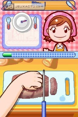 Une simulation de cuisine ? Le concept ou plutôt la recette ne date pas d’hier, du moins au Japon où le genre s’est taillé une belle réputation auprès de la nouvelle génération de joueurs mais surtout de joueuses, cible première de ces jeux au concept bien décalé. Dans Cooking Mama, le joueur endosse donc le tablier d’un jeune apprenti cuisinier qui va apprendre en quelques coups de cuillère à pot à préparer des recettes classiques de la gastronomie japonaise. Soupe Miso, gyozas grillés, curry de porc, Takoyaki, riz aux pousses de bambou, Tonjiru, des plats exotiques auxquels se mêlent des recettes venues de l’Occident tels que le poulet rôti, le steak frites, la pizza, la côtelette de porc ou bien encore les spaghettis à la Napolitaine. Ce n’est pas moins de 120 recettes qui nous attendent au total dans Cooking Mama, des préparations culinaires que l’on découvre au fur et à mesure que l’on réussit les diverses préparations dans le mode "Cuisine". Il va donc falloir se montrer à la hauteur pour pouvoir débloquer l’ensemble des 120 recettes et gagner ses galons de Maïté ou de Cyril Lignac en herbe, c’est vous qui choisissez.