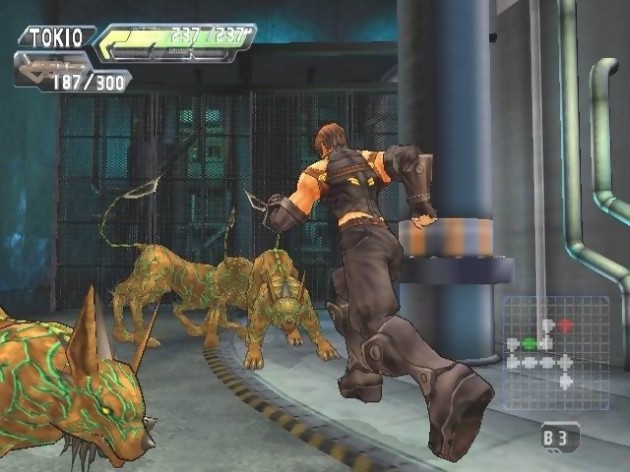 Dream Factory et Spike, les développeurs de ce beat’em all exclusif à la PlayStation 2, nous plongent admirablement bien dans l’univers SF de Crimson Tears, et n’ont pas à rougir face à un Metal Gear Solid à ce niveau-là. Pourquoi diable une telle comparaison ?! Le découpage scénaristique et les musiques qui accompagnent les cut-scenes sont assez proches de la saga d’Hideo Kojima. Ainsi donc on découvre au fur et à mesure de notre progression pourquoi le chaos règne sur Tokyo après l’explosion d’un building A.R.M.A. La firme A.R.M.A est le plus gros fabriquant d’armes biologiques de la capitale. Visuellement, il s’agit d’êtres humains à ceci près que leur ADN a été modifié afin d’améliorer leurs compétences, afin d’en faire des véritables machines de guerre. Mais à force de créer des soldats nouvelle génération, A.R.M.A se retrouve débordé et doit créer trois prototypes humanoïdes pour enrayer une subite mutinerie. Et à la manière de Final Fight ou Fighting Force, il faudra choisir parmi ces trois protagonistes et, galanterie oblige, on commencera par les dames. La première se prénomme Amber. Habile avec les armes blanches, elle excelle tout particulièrement dans les combats à deux épées. On retrouve ensuite Kadie, une jolie rouquine de 16 ans. C’est la plus polyvalente des personnages, puisqu’elle manie aussi bien les lames, que les flingues ou les bombes. Malheureusement, elle ne peut bloquer les attaques ennemies ce qui la rend particulièrement vulnérable. Pour conclure, il y a bien évidemment le beau gosse de service : Tokio, l’expert en armes à feu. Mais il faut les voir avant tout comme des armes biologiques humanoïdes. Il est vrai que le character design ne nous facilite pas la tâche tant le niveau visuel de notre trio d’enfer est réussi. Le charisme des personnages prend toute son ampleur lors des cut-scenes, que ce soit à travers leur tenue vestimentaire (y a pas à dire, le cuir ça claque !) ou dans leurs propos. Cependant, Amber, Tokio ou Kadie ont la fâcheuse tendance à ne pas trop bouger les lèvres pendant les dialogues. C’est un peu bête mais ça saute aux yeux !