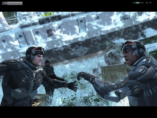 Une île tropicale, des méchants dans tous les sens, un super héros, un ton très premier degré, une brochette de clichés et pas mal de beaux sentiments, Crytek a réuni tous les ingrédients du jeu à grand spectacle dans son nouveau FPS. Perdu dans la jungle avec pour seul objectif de rallier différents points de mission, Nomad trace sa route à grands renforts d'explosions et de distributions de balles. La nanocombinaison est toutefois dotée de quelques caractéristiques qui permettent de briser le morne quotidien du sauveur au grand calibre. Accessible d'un clic sur le bouton 3 de la souris, la liste de ces pouvoirs laisse rêveur : armure maximum, vitesse maximum, force maximum ou camouflage, libre à vous de choisir le petit bonus que vous préférez, et d'en changer en fonction de la situation. Un groupe d'infanterie se dirige droit sur vous ? Fondez-vous dans le décor et dépassez-le pour être tranquille. Vous vous retrouvez en très mauvaise posture et l'abri le plus proche vous semble inaccessible ? Avec le mode vitesse, vous pourrez presque échapper aux balles. Evidemment, toutes les bonnes choses ont une fin, et votre très seyant vêtement épuise ses réserves d'énergie en quelques secondes. Le temps que celles-ci se rechargent, vous devez agir comme un vrai soldat, à savoir tirer plus vite et avec davantage de précision que votre ennemi. Si on aurait vraiment apprécié que la nanocombinaison dispose d'un peu plus de jus, elle apporte toutefois pas mal de fraicheur à la partie et vous permet de trouver différentes solutions à un même problème. Dans le feu de l'action, le passage d'une aptitude à l'autre est certes un poil délicat, mais la perspective d'envoyer valdinguer n'importe qui à 10 mètres d'un coup de poing ravageur fait vite oublier ces petits inconvénients.