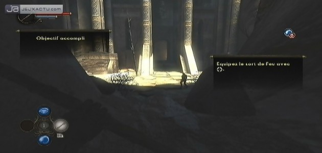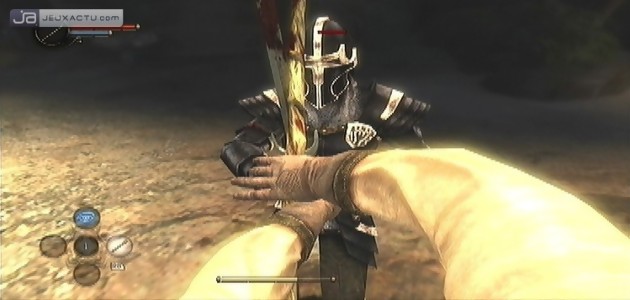 C’est vrai qu’un premier coup d’œil, le jeu d’Ubisoft ressemble à s’y méprendre à Oblivion : une jauge de mana, des points de santé, des sorts magiques, une barre d’expérience et de beaux chevaliers prêts à en découdre avec vous ; aucun doute possible, visuellement Dark Messiah of Might and Magic : Elements nous plonge dans les clichés du RPG à la sauce heroic-fantasy. Il en va de même pour les décors souvent travaillés. Du village atypique de Heaumroc et ses chaumières accueillantes, aux grottes suantes et abritant diverses créatures tourmentées aux temples majestueux, en passant par quelques geôles et une île sauvage ; même le système de jeu s’y prête avec un Sareth évolutif qui glane son expérience au fil des combats et des quêtes menées à bien. Mais dès le premier gain de niveau et après avoir sélectionné votre classe, on se rend vite compte de la supercherie. Il est en effet impossible de personnaliser ses compétences. A la différence de la version PC, tout se fait automatiquement et par conséquent, on n’est dans l’incapacité de faire progresser les points faibles de son avatar. Auparavant, vous pouviez rajouter quelques points au combat, à la magie ou aux compétences annexes afin de créer un personnage hybride, sans rester dans les carcans imposés par votre classe. On se contentera alors des restes pour simuler un quelconque RPG, c’est-à-dire un arsenal qui s’améliorera au fil des heures, de nouveaux sorts à débloquer et d’un équipement secondaire toujours utile pour perfectionner certaines compétences. Pour profiter des prouesses physiques des autres classes, vous n’aurez d’autre choix que de recommencer le jeu en sélectionnant l’un des quatre rangs proposés (guerrier, archer, mage assassin) qui ont chacun leurs points forts et leurs points faibles. C’est sûr de ce point de vue là, Dark Messiah of Might and Magic : Elements propose une replay-value intéressante, mais un tantinet trafiquée.