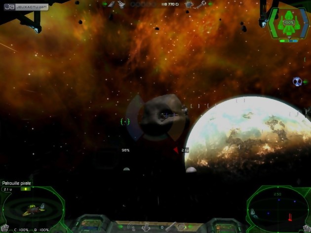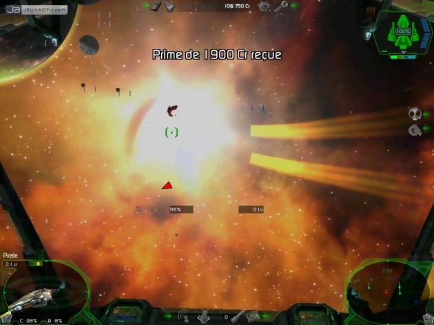 Comme d’habitude, la zone du début vous permet de vous confronter à des adversaires de pacotille. L’élimination d’un pirate vous rapporte par exemple 200 crédits. Plus vous avancez dans l’aventure, plus cela rapporte d’argent. A la moitié de l’aventure par exemple, les primes avoisinent les 3000 crédits (ce n’est pas sans raison, le matériel coûte lui aussi extrêmement cher). Mais si vous revenez dans une constellation du début, les bénéfices tirés de chaque élimination pirate restent les mêmes. Bref, il n’existe aucune situation de blocage lié à l’argent, ce qui est réellement appréciable. D’autres apparaissent, malheureusement et elles sont liées à des bugs. A plusieurs reprises, nous avons pu relever des missions tellement scriptées que s’éloigner d’un centimètre de celle-ci provoquait dans le meilleur des cas un "Game Over", dans le pire, une situation de blocage. Dans ce cas, il ne reste plus qu’à reprendre la sauvegarde automatique en priant pour que celle-ci n’ait pas eu lieu après le blocage en question. D’une manière générale, il convient de sauvegarder très régulièrement.