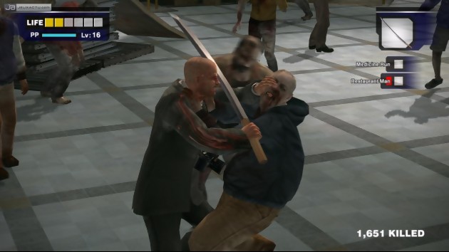 A ces armes déjà bien nombreuses viennent s’ajouter les véhicules (moto, voiture, camion, tank) qui permettront à notre reporter d’avancer plus rapidement, mais surtout de faire grimper son score et donc ses points s’expérience de manière plus efficace. Une jouissance assez primaire, tout comme le système de sauvetage des innocents que Franck est amené à escorter jusqu’au QG, dernier bastion humain de ce mall zombifié. L’astuce pour les amener à bon port est simple couchée sur le papier mais diablement corsée une fois sur le terrain. L’interaction entre Franck et ses acolytes est limitée. "Follow me", "stay there", ce sont les seules actions que peut exiger notre reporter. Toutefois, il arrive par moments qu’il faille les aider physiquement dans le sens où Franck peut très bien les porter dans le dos, en cas de cheville foulée. Dans le cas présent, notre héros ne pourra pas se défendre et choisir la voie de la fuite semble être une bonne solution. Un détail plutôt bienvenu et qui permet ainsi d’augmenter un peu plus la pression.