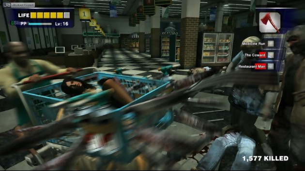 A ces armes déjà bien nombreuses viennent s’ajouter les véhicules (moto, voiture, camion, tank) qui permettront à notre reporter d’avancer plus rapidement, mais surtout de faire grimper son score et donc ses points s’expérience de manière plus efficace. Une jouissance assez primaire, tout comme le système de sauvetage des innocents que Franck est amené à escorter jusqu’au QG, dernier bastion humain de ce mall zombifié. L’astuce pour les amener à bon port est simple couchée sur le papier mais diablement corsée une fois sur le terrain. L’interaction entre Franck et ses acolytes est limitée. "Follow me", "stay there", ce sont les seules actions que peut exiger notre reporter. Toutefois, il arrive par moments qu’il faille les aider physiquement dans le sens où Franck peut très bien les porter dans le dos, en cas de cheville foulée. Dans le cas présent, notre héros ne pourra pas se défendre et choisir la voie de la fuite semble être une bonne solution. Un détail plutôt bienvenu et qui permet ainsi d’augmenter un peu plus la pression.