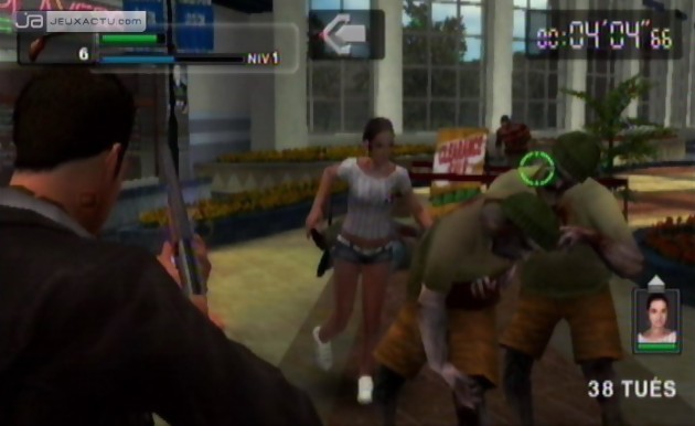 Si les développeurs ont dû faire quelques concessions en raison de faiblesses techniques inhérentes à la Wii, ils se sont aussi permis quelques coupes dans le scénario et dans le gameplay également. Envoyé à Willamette pour couvrir l’événement pour un quotidien, Franck West ne quitte jamais son réflex, l’arme ultime qui lui permettra de faire éclater l’affaire au grand jour. Dans la mouture Xbox 360 de Dead Rising, notre héros devait prendre des clichés pour faire évoluer l’histoire, mais aussi gagner des points d’expérience. Tout cet aspect narratif et essentiel au bon déroulement du jeu a été purement et simplement évincé de la version Wii. La première séquence par exemple, celle où Franck doit photographier des scènes atroces depuis l’hélicoptère a disparu. Deux cinématiques se succèdent alors sans trop de cohérence, laissant alors le joueur non averti dans un flou scénaristique de quelques minutes. Mais l’absence de photos n’est pas le seul élément qui a été supprimé du montage final puisque la notion de temps réel a été, elle aussi, mise de côté. Des zombies en sous-nombre, un chronomètre absent, il n’y a plus aucune raison pour que le joueur stresse face à l’invasion de ces êtres infectés.