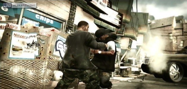 Vous l’aurez donc compris le mode "Monter un Label" mise avant tout sur les combats. Et là on approche du point sensible de Def Jam : Icon. Comme stipulé durant la campagne promotionnelle du jeu, Electronic Arts a joué gros sur le mélange baston de rue et musiques. Le résultat est aussi étrange qu’intéressant puisque les décors dans lesquels vous évoluerez bougent au rythme des basses de chaque morceau, différent d’un artiste à un autre. Par conséquent, les éléments présents dans l’arène se déforment petit à petit, se brisent au son des basses, explosent ici ou là. Cette interaction n’est pas là que pour nous émerveiller la rétine mais elle représente un véritable danger de tous les instants pour quiconque se retrouve balancer contre une pompe à essence, une bagnole, un hélicoptère, une gogo danseuse ou une cheminée. Danger pour l’un mais allier pour l’autre. Vous devrez donc tendre l’oreille afin d’attaquer au rythme de la musique et faire un maximum de dégâts. Mais si vous êtes du genre impatient, vous pouvez également différer le beat grâce aux platines DJ associées aux sticks analogiques gauche et droite. Le premier permet, en maintenant LT ou L2, de passer le morceau associé à votre rappeur. Ce changement de son permet à son combattant de booster la puissance et la rapidité de ses attaques. L’autre stick scratche la musique afin de déclencher simultanément les objets interactifs du décor. Une fois ces deux paramètres bien intégrés, il ne vous reste plus qu’à réduire en charpie votre adversaire.
