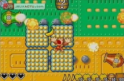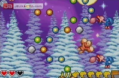 Oubliez la croix directionnelle, les boutons A et B et concentrez vous sur les gâchettes, King of Swing vous propose un gameplay inédit qui dès les premières minutes de jeu se révèle efficace. Se déplaçant à l’aide des touches R et L, Donkey retrouve ses instincts primitifs et se balance désormais, non pas de liane en liane, mais de bloc en bloc, osant parfois quelques voltiges périlleuses. Vous contrôlez en effet, non pas le gorille lui-même, mais ses poings, et une pression sur une gâchette serrera le poing correspondant, laissant ainsi notre primate bien fixé aux points d’ancrage. On se surprend alors de la facilité avec laquelle on se balance et se projette dans les hauteurs pour attraper les bananes et progresser tout au long d’une aventure qui viendra varier les plaisirs. On découvrira alors des montagnes enneigées où les blocs glacés compliquent les prises, des mécanismes nous faisant tournoyer pour gagner en vitesse ou encore des tonneaux propulseurs où tel un Rocketeer, Donkey écumera les cieux. Cette originalité se conforte au niveau des Boss, puisque chacun d’entre eux demandera une approche différente, avec une mention particulière pour le monstre marin qui exigera d’être assommé avant de lui donner le tournis en le projettent sur des pics redoutables. Pour se défendre dans ce monde peuplé progressivement de plus en plus d’ennemis, Donkey Kong pourra se concentrer en serrant les deux poings avant de se projeter sur ses cibles tel un boulet de canon. Si le stock de bananes le permet, il pourra même passer dans une sorte de mode furie qui lui permettra d’être temporairement invincible, mais surtout de sauter plus haut pour atteindre par exemple des médailles difficiles d’accès ou des zones bonus. Celles-ci permettent bien souvent de renouveler son stock de fruits, mais peuvent surtout cacher des cristaux à récupérer pour finir le jeu à 100%.