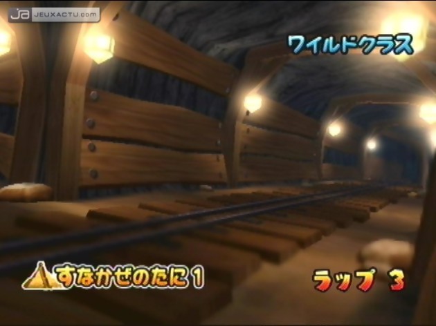 Difficile en effet de ne pas penser à Mario Kart lorsque l'on voit Donkey Kong tenter de rassembler tous ses potes autour de pseudo-landspeeders lancés à grande vitesse. C'est d'ailleurs pour noyer le poisson dans l'eau que Donkey Kong Jet Race adopte un habillage proche de celui de Donkey Konga, avec des menus lustrés à la cire d'abeille et des backgrounds à base de palmiers et de noix de coco. Des proches de la famille tels que Cranky Kong ou bien encore Candy Kong se glissent même dans le costume de guide de service pour faciliter la navigation. Concernant la réalisation, Donkey Kong Jet Race ne casse pas des briques et se contente du strict minimum syndical pour une console next gen', YUV activé ou pas. Aucun circuit ne parvient à claquer la rétine, si ce n'est certains secteurs mieux réussis que d'autres, comme la jungle et ses bananiers qui filtrent les rayons de soleil, ou bien les montagnes enneigées et leurs flocons. Quelques séquences au bord de la mer ou dans le désert de l'Egypte pharaonique sont aussi sympathiques, mais il est évident que les paysages souffrent d'un vide assez hallucinant. Pour mieux faire passer la pilule, le framerate ne connaît aucune baisse de régime, même si ce n'est pas du WipeOut en matière de vitesse de pointe. L'affichage respecte les standards des jeux de course : la position actuelle du joueur, celle des concurrents, la map du circuit, les items récupérés et le chronomètre. A droite de l'écran se trouve la barre de boost. Chaque banane récoltée permet de la gonfler, ce qui n'augmente pas la vitesse de pointe mais fournit des turbos que l'on peut utiliser en pressant le stick vers le bas. Donkey Kong Jet Race la joue même subtil puisqu'un système de combos à été mis en place. Explications : à chaque fois que l'on pulvérise un baril en plein turbo, on bénéficie d'une nitro supplémentaire qui est consommée immédiatement. En gros, il est possible, avec un turbo, de parcourir plusieurs mètres à grande vitesse pour peu que l'on vise correctement les tonneaux. Pas de rétro à se mettre sous la dent, juste des avatars qui apparaissent en transparence en bas de l'écran pour signaler la proximité d'un adversaire. C'est propre, mais ultra-basique.