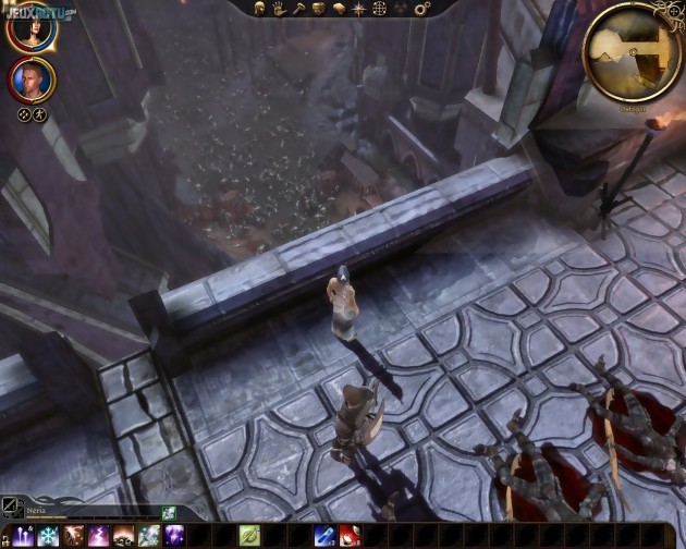 Tout Bioware et "baldurien" qu'il soit, Dragon Age : Origins n'en devient pas pour autant un intouchable, auquel on ne peut objectivement rien reprocher. Nous avons déjà évoqué la régression à quatre personnages, contre six au bon vieux temps, mais on peut également relever de nombreux problèmes d'ordre technique. Tout d'abord, il est impossible de sauter, ce qui est toujours frustrant lorsqu'on se déplace en vue à la troisième personne. La vue haute ne pose pas ce problème, mais on aurait apprécié que le zoom arrière soit plus puissant, afin d'obtenir une meilleure visibilité. Et si les héros ne savent pas sauter, ils ne savent pas non plus nager. Le moindre cours d'eau les bloque désespérément, quand bien même ils ont manifestement pied. Pire encore, quelques murs invisibles nous empêchent ponctuellement d'aller où on le souhaiterait. La liberté de déplacement est d'autant plus réduite que chaque zone que l'on visite, qu'elle soit intérieure ou extérieure, n'occupe qu'une faible surface. Passer d'un étage à un autre dans un bâtiment occasionne ainsi un écran de chargement. Il en va de même lorsqu'on rentre dans une auberge située en ville ou qu'on essaye de se balader un peu trop longtemps dans la nature. Difficile de ne pas voir là une concession faite aux limitations techniques des consoles, puisque nous avons affaire à un développement multiplateformes. Un état de fait qui n'excuse pas les autres problèmes rencontrés, parmi lesquels : des animations de marche assez rigides, une latence dans l'enchaînement de certains dialogues qui nuit au réalisme, des différences ponctuelles entre les textes parlés et leurs sous-titres, ainsi qu'une version française en dents de scie, qui alterne doublages convaincants et phrases surjouées. D'autres défauts plus conceptuels se font également jour au fil de l'aventure, à commencer par l'absence de réaction des PNJ lorsqu'on pille leurs coffres ou leurs étagères devant eux. Un mois après avoir joué à Risen, une telle invraisemblance se fait forcément remarquer. Autre artifice de gameplay que le titre de Piranha Bytes avait su éviter : certains objectifs de quêtes ne sont présents dans les niveaux qu'une fois les missions correspondantes acceptées. Bref, nous avons vraiment affaire à un jeu de rôle à l'ancienne, avec tout ce que cela comporte comme archaïsmes.