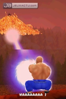 Bien que la croix directionnelle soit utilisée pour déplacer le jeune Goku, Dragon Ball : Origins est la preuve que le tout-stylet n’est pas nécessairement de bon aloi sur DS. Fortement inspirée de The Legend of Zelda : Phantom Hourglass, la prise en main de base se révèle ici imprécise. Combiné à l’importante panoplie de mouvements dont a droit notre héros, ce constat n’en est que plus renforcé. Entre l’impossibilité de switcher du mode mains nues au mode bâton magique lorsqu’on est en mouvement, et la très grande variété de tracés nécessaires à l’exécution des différentes attaques, il n’est pas rare que le personnage ne réagisse pas comme on le voudrait. Des petits tracas qui peuvent se révéler bien plus problématiques face aux boss. Principale source de challenge, ils requiert comme souvent d’un minimum de jugeote et de sens de l’observation afin d’être mis à mal, ce qui est plutôt une bonne chose. Ce qui l’est moins en revanche, c’est leur exotisme parfois prononcé qui tranche radicalement avec l’attention qui découle de toutes les cinématiques liant deux chapitres. Sans compter que la visibilité n’est pas un point fort du titre (la liaison entre les deux écrans n’étant pas assurée, on évolue en permanence avec une sorte “d’angle mort”) et vous comprendrez que les nombreuses libertés et erreurs de conception que se sont octroyées les développeurs nuisent à l’immersion, ainsi qu’à l’intérêt du titre. La partie baston n’améliore en rien le bilan de ce Dragon Ball : Origins puisqu’elle souffre des mêmes tares. Dommage, car hormis l’ambiance sonore, Game Republic avait plutôt bien fait les choses en offrant un système de jeu classique mais efficace, où la progression passe par la redistribution de points de talent et l’acquisition de bonus de santé et de Ki à dénicher dans les nombreux coffres qui se cachent dans les niveaux. La jauge de Ki est d’ailleurs assez importante puisqu’elle couve en fait l’endurance de Goku. La durée de vie y avait également mis du sien (notre compteur affiche un peu moins de neuf heures de jeu en ligne droite, sans compter les quelques game over) avec une bonne dizaine d’épisodes bonus ou la possibilité de collectionner et d’échanger des statuettes. Mais naturellement, cela n’empêche pas Dragon Ball : Origins d’être une petite déception.