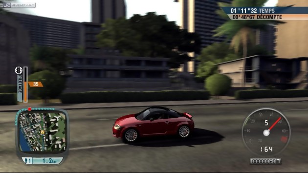 Mais le fric ne se gagne pas par la simple volonté du Saint Esprit. Il faudra enchaîner courses sur courses pour augmenter son pactole surtout que la vie hawaïenne est on ne peut plus onéreuse. Le fait de claquer du pognon dans de belles décapotables vous obligera à faire d’autres dépenses matérielles. Les concessionnaires ne font pas garage à leurs heures perdues. Vous devrez donc vous loger pour pouvoir stocker vos premières caisses. Mais au fur et à mesure de vos investissements automobiles, il faudra également faire un détour par les nombreuses agences immobilières afin de s’offrir un garage plus spacieux et pouvant stocker jusqu’à 10 voitures en même temps. Mais à 3.000.000 de dollars la demeure, mieux vaut se concentrer sur les courses. En plus des 26 épreuves de Vitesse, vous disposez d’une cinquantaine de courses contre les bots. Ces dernières peuvent être sur plusieurs tours, directes ou à élimination avec toujours la contrainte d’utiliser la classe de voiture adéquate. 76 défis pour l’instant et on n’en a pas encore fait le tour car le deuxième type de challenges omniprésent sont les courses contre la montre. Au nombre de 44, elles permettent de gagner gros mais il faudra souvent prendre sur soi, décrocher le téléphone et ne pas répondre aux alertes MSN pour ne pas être déranger.