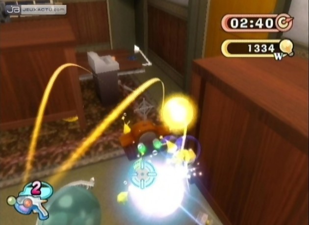 Mais revenons à la chasse d’Eledees qui vous oblige à avoir de bons réflexes. Au fur et à mesure de votre progression, la difficulté ira crescendo nous faisant oublier la facilité des premières parties et vous devrez donc identifier chaque espèce d’Eledees ainsi que leur états. Selon si vous les prenez par surprise en secouant une boîte ou les découvrez endormis derrière une pile de bouquins, la récolte de Watts sera plus ou moins importante. Il va sans dire qu’un Eledees chanteur vous rapportera plus qu’une créature craintive qui s’enfuit. Pour les capturez, le principe est le même que vous déplacer les objets, vous devrez pointer l’écran et aligner le viseur sur la bestiole avant de la zapper avec l’un des boutons principal de la Wiimote. Le seul problème dans votre collecte d’électricité, c’est que certains objets ne bougeront pas d’un centimètre à cause de leur poids. Il est d’ailleurs étonnant de ne pas pourvoir soulever une Wii en jeu dès les premières minutes de gameplay. Enfin bref ! Vous devrez améliorer votre pistolet pour poursuivre votre recherche et c’est à ça que servent les Eledees Générateurs. Les petits malins se planquent dans les objets électriques et par conséquent vous devrez récupérer suffisamment de Watts pour pouvoir activer une lampe de chevet, une télévision, un broyeur de CD, un train électrique ou encore une console de jeu made in Nintendo. Vous devrez activer l’item en question et capturez aussi vite que possible les créatures qui en sortiront. Un message à l’écran vous avertira de votre progression et vous pourrez alors soulever quelques kilos supplémentaires, ouvrir certaines portes ou activer des mécanismes. La chasse aux Eledees devient donc de plus en plus difficile et certaines missions sont même marquées par des objectifs à respecter scrupuleusement (éviter de faire du bruits, ne pas casser certains objets) ou des Eledees à éviter. Heureusement, il existe aussi suffisamment de bonus tels que le laser aspirateur, le filet laser, le choc électromagnétique, le gâteau pour Eledees, le radar, j’en passe et des meilleurs. Mais malgré tous ces efforts, on tombe rapidement dans un système de jeu peu varié et la trentaine de missions disponibles commence à nous taper sur le système. Des objectifs variés et certains niveaux en extérieur auraient certainement sauvé les meubles. Soulever, balancer, capturer, arracher, activer, soulever, balancer, capturer, arracher, avec de telles actions si les premières minutes sont amusantes, on s’en lasse tout de même rapidement.