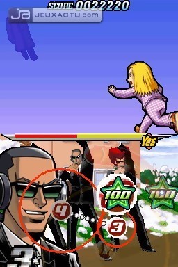 Mais avant d’aller sillonner la ville à grands renforts d’encouragement vocaux, il va falloir choisir son capitaine. Le jeu nous propose deux groupes de trois agents différents. Le premier est mené d’une main de fer par "J" , celui qui figure sur la jaquette du jeu et facilement identifiable par ses cheveux jaunes formant une banane. La seconde équipe est dirigée par l’agent Spin, crâne rasé et portant des écouteurs. Si au premier coup d’œil, les deux équipes semblent identiques en tous points, elles correspondent en réalité au niveau de difficulté du jeu. "Facile" pour Spin et "Difficile" pour Jay. Mieux vaut d’ailleurs commencer par Spin pour ne pas voir apparaître le Game Over à l’écran au bout de 20 secondes de jeu, car la difficulté de Elite Beat Agents est savamment corsée, pour ne pas dire rebutante. Pourtant sur le papier, le principe du jeu est relativement simple : appuyer sur des pastilles numérotées dans un ordre précis et surtout en fonction du rythme et du timing demandé, à savoir au moment où le cercle coïncidera avec la pastille en question, le tout sur fond de musiques entraînantes. Si au départ, on n’arrivera sans problème à enchaîner les actions, d’autres éléments perturbateurs viendront épicer le gameplay comme ces canalisations où il faudra suivre la boule d’un bout à l’autre sans jamais lever le stylet de l’écran tactile. Il faudra faire attention à ne pas dévier de la trajectoire sous peine d’être sanctionné par une baisse de la jauge de réussite. De temps à autres, il faudra également faire plusieurs allers-retours dans ces tubes et le cas échéant, une flèche apparaîtra subitement pour vous avertir de faire demi-tour. Pas toujours évident surtout lorsque ces canalisations affichent des formes souvent farfelues. Et oui, Elite Beat Agents favorise le par cœur à l’instinct et c’est aussi cela qui fait son charme.