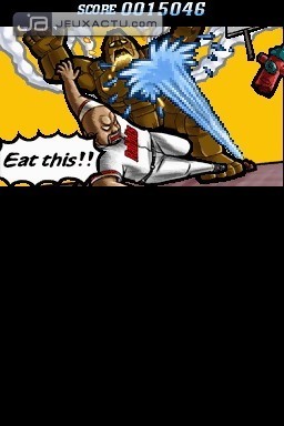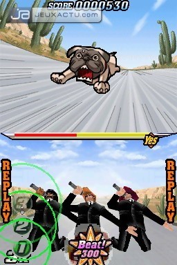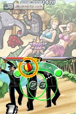 Mais avant d’aller sillonner la ville à grands renforts d’encouragement vocaux, il va falloir choisir son capitaine. Le jeu nous propose deux groupes de trois agents différents. Le premier est mené d’une main de fer par "J" , celui qui figure sur la jaquette du jeu et facilement identifiable par ses cheveux jaunes formant une banane. La seconde équipe est dirigée par l’agent Spin, crâne rasé et portant des écouteurs. Si au premier coup d’œil, les deux équipes semblent identiques en tous points, elles correspondent en réalité au niveau de difficulté du jeu. "Facile" pour Spin et "Difficile" pour Jay. Mieux vaut d’ailleurs commencer par Spin pour ne pas voir apparaître le Game Over à l’écran au bout de 20 secondes de jeu, car la difficulté de Elite Beat Agents est savamment corsée, pour ne pas dire rebutante. Pourtant sur le papier, le principe du jeu est relativement simple : appuyer sur des pastilles numérotées dans un ordre précis et surtout en fonction du rythme et du timing demandé, à savoir au moment où le cercle coïncidera avec la pastille en question, le tout sur fond de musiques entraînantes. Si au départ, on n’arrivera sans problème à enchaîner les actions, d’autres éléments perturbateurs viendront épicer le gameplay comme ces canalisations où il faudra suivre la boule d’un bout à l’autre sans jamais lever le stylet de l’écran tactile. Il faudra faire attention à ne pas dévier de la trajectoire sous peine d’être sanctionné par une baisse de la jauge de réussite. De temps à autres, il faudra également faire plusieurs allers-retours dans ces tubes et le cas échéant, une flèche apparaîtra subitement pour vous avertir de faire demi-tour. Pas toujours évident surtout lorsque ces canalisations affichent des formes souvent farfelues. Et oui, Elite Beat Agents favorise le par cœur à l’instinct et c’est aussi cela qui fait son charme.