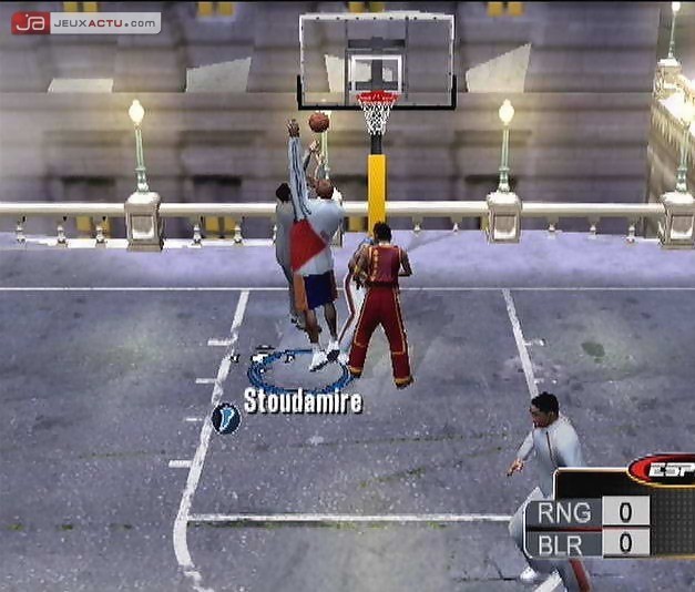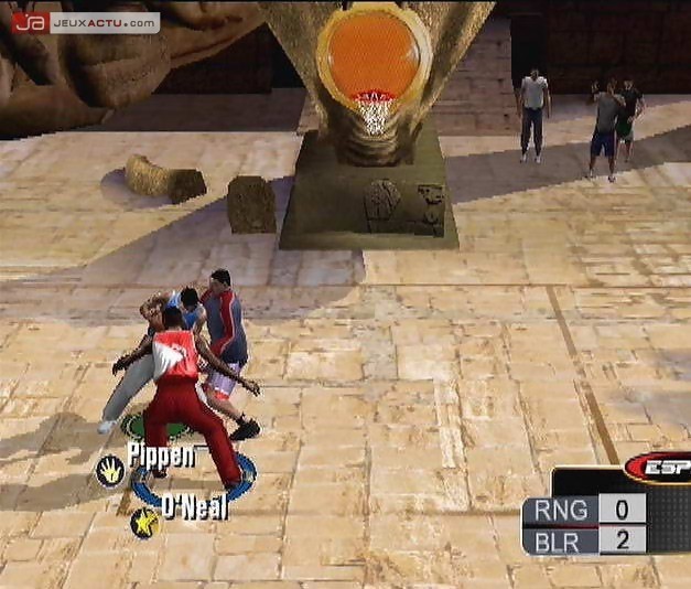 L’intelligence artificielle générale est bien pensée et vos adversaires accentueront plus la pression en fin de match si le score est serré par exemple, multipliant au passage le nombre de fautes. Les lancers francs réclament pas mal de doigté, notamment parce qu’ils jouent sur la sensitivité des gâchettes. L’angle de vue par défaut est totalement injouable mais vous pourrez heureusement passer par le menu "Options" pour y remédier, soit en sélectionnant un autre déjà existant, soit en l’éditant pour l’adapter selon vos envies. Et pour le coup, vous aurez même droit à un petit replay pour les plus belles actions. La réalisation est honorable, notamment grâce à une modélisation des personnages de bonne facture et de nombreux environnements urbains ou intérieurs plutôt bien détaillés. De même, le public est loin d’être statique et s’agite au gré de vos actions et du trémoussement des pom-pom girls. Coté son, les compositions piochent un peu dans tous les styles et pouvoir organiser sa play-list via le juke-box est plus que sympathique, mais avouons le franchement, on est loin des bandes sonores soignées d’Electronic Arts.