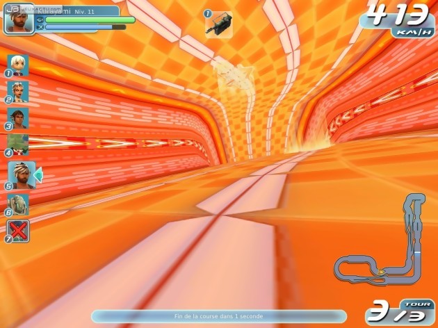 Le NPC chargé des courses nous laisse le choix entre trois modes de jeu : partie instantanée, mode officiel, mode amical. En partie instantanée, ce brave homme se charge de tout et nous envoie directement dans une partie déjà existante ; il ne reste plus alors qu'à attendre que la course démarre. Vient ensuite le mode officiel permettant de disputer une course afin d’améliorer son classement officiel sur le serveur ; chaque victoire ou défaite a donc son importance. Enfin, il y a le mode amical qui sera sûrement le plus fréquenté. Dans ce dernier, on dispute une course à la fin de laquelle nous gagneront de l'argent, des points de grade et d’expérience quel que soit le résultat. Bien sûr, les points attribués varient selon les performances. Contrairement à un Mario Kart pour ne citer que lui, on ne dispose pas d’une super démarrage sur la ligne de départ. Nous avançons donc "tranquillement" à 400 km/h avec notre vaisseau de débutant. L'effet de vitesse n'est pas flagrant visuellement, mais on comprend bien vite qu'un pilotage bourrin ne mènera pas à la victoire. En effet, la maniabilité du vaisseau est loin d'être parfaite, et il faudra donc ralentir dans les virages et éviter de se cogner dans les murs. Pour rattraper efficacement les Sliders qui nous précèdent, il ne faut pas hésiter à consomme les furies. En effet, il est possible de détruire les Sliders qui possèdent chacun une barre de défense et une barre d'exagen. Lorsque la première tombe à zéro c'est l'explosion, et on perdra alors de précieuses secondes le temps que notre Slider réapparaisse à l'arrêt sur la piste. L'exagen, quant à lui, sert à activer des capacités spéciales permettant de pulvériser le vaisseau le plus proche devant nous, ou bien se régénérer. La course s’apparente même parfois à une séance d’esquives rotatives, chacun prenant soin d'éviter les pièges - bombes, bumper, hélices… - éparpillés sur le circuit, lorsqu’il n’est pas occupé à soigner sa conduite, ou prendre un maximum d'accélérateurs. Pour les amateurs de jeux de course, rassurez-vous, plusieurs vues – intérieure, proche, éloignée - sont disponibles. Néanmoins, la vue intérieure présente un sérieux problème : en mode furie, la visibilité est très altérée, voire quasiment réduite à zéro. Autant dire que les compétitions avec le son premier Slider paraissent parfois monotones. Il est difficile de rattraper les concurrents, à part erreur de leur part. D’où l’importance des furies qui permettent de grapiller quelques places au classement. Plus tard dans le jeu, on pourra fixer des armes à l'avant du vaisseau pour rendre les affrontement un peu plus intéressants. En termes de contenu, Exalight propose une quinzaine de courses, avec un niveau de difficulté – facile, moyen, difficile - qui leur est propre. Il existe aussi les arènes qui sont au nombre de trois. Ici, le but est de détruire un maximum de Sliders comme dans un bon vieux Destruction Derby. De petites boules vertes ou bleues sont parsemées dans l'arène permettant de recharger la défense pour les premières, et l'exagen pour les secondes. Le classement est ensuite établi en fonction des points remportés. Bien entendu, les arènes sont bien plus amusantes à jouer lorsque notre Slider possède une arme.