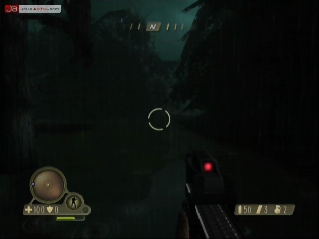 Où est le problème, me direz-vous ? Far Cry Instincts est beaucoup trop facile, vous rétorquerai-je. Et outre un manque de challenge évident, cette aisance déconcertante à avancer dans les niveaux noie les bonnes intentions issues des possibilités de gameplay varié. Là où nous annonçait une bonne dose d’infiltration, il n’y a que du très classique rentre-dedans. Pourquoi se fatiguer à poser des pièges, ramper sous les huttes et à prendre gare à ne pas faire se repérer là où le bon vieux rentre-dedans des familles est amplement suffisant. L’indicateur du niveau d’alerte des ennemis n’est alors plus utile et le fait que le viseur se teinte de rouge une fois un ennemi en mire nous permet même de tirer à l’aveugle sans prendre de gros risques. On avance, on tire dans le tas et on compte les cadavres, l’I.A. parfois défaillante n’étant pas là pour nous causer de véritables soucis. Entre les soldats qui se laissent allègrement tirer dessus ou les snipers qui se rapprochent de vous, les comportements laissent parfois à désirer. Pis, une fois transformé en mutant, vous regagnez constamment de la vie et la profusion des munitions et des kits de santé vous assure une progression désarmante de facilité. Il y a certes deux trois combats face à de gros mutants et un affrontement final un peu plus corsé, mais la sensation de parcourir des kilomètres sans réelle opposition est omniprésente. De plus, on regrettera un level design finalement très classique et n’hésitant pas à réitérer une situation donnée plus qu’il n’en faut. Les exemples sont légion dans le domaine, un des plus frappants étant un passage dans la jungle où vous croisez une première fois un groupe d’ennemis suivis par un sniper perché sur un arbre. OK, sympa à défaut d’être original, la séquence fonctionne plutôt bien. Deux minutes plus tard, nouveau groupe d’ennemis accompagnés d’un sniper sur un arbre. Mouais… Deux minutes plus tard, devinez ce qui se profile ? J’imagine que vous tenez la réponse… Si vous ajoutez à cela une musique vite insupportable, mes compagnons de bureau me regardant d’un œil de plus en plus sombre au fil des heures passées sur le jeu, vous comprendrez que Far Cry Instincts est loin d’être le hit annoncé.