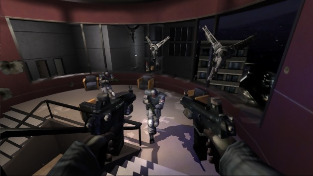 En grande majorité dans les FPS traditionnels (Halo, Call of Duty, Doom, Quake et j’en passe…), le principe consiste à tirer à tout va, puis à se planquer pour recharger et attaquer à nouveau laissant peu de répit aux ennemis. Ici, c’est tout l’inverse sans tomber dans le FPS tactique à la sauce Tom Clancy. Les séquences de jeu sont rythmées par les attitudes des adversaires. J’entends par-là que si vous êtes le premier à faire feu, vous devrez bouger et agir en fonction des actions ennemies pour le moins imprévisibles. Non pas qu’ils fassent n’importe quoi sur le champ de bataille mais c’est avec difficulté que l’on peut prévoir leurs mouvements. Tantôt planqués derrière une caisse, ils n’hésiteront pas à vous contourner dès lors que vous regarderez ailleurs. Et lorsqu’ils se sentent acculés, ils feront preuve de débrouillardise pour se sortir du pétrin en sautant par-dessus une balustrade ou en envoyant une grenade dans votre cachette de fortune. A cela, il ne faut pas non plus oublier que les adversaires font preuve d’une précision chirurgicale et feront mouche à coup sûr. Lorsqu’ils débarquent en masse – ça arrive quand même – vous pouvez gérer la situation avec votre acuité physique emprunte à la Max Payne. Le bullet-time est une nouvelle fois de la partie et permet de ralentir l’action afin de vous laisser le temps d’aligner cible sur cible. Mais cette fonction est limitée et mieux vaut garder un œil sur la jauge en bas de l’écran pour ne pas se retrouver dépourvu lorsque celle-ci est vide. Cela dit, au fur et à mesure de votre progression vous récupérerez de bonus pour augmenter l’utilisation du ralenti ou gonfler votre niveau de vie de manière définitive.