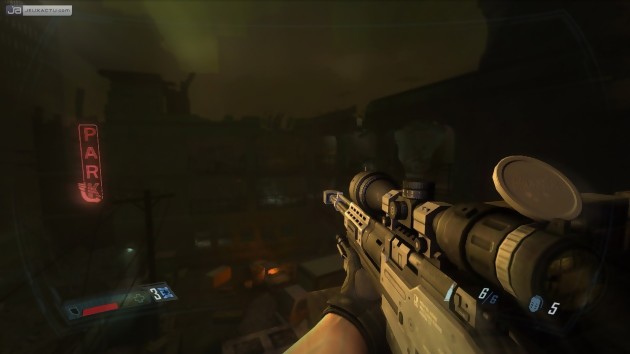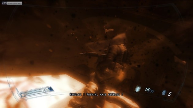 Premier élément à se présenter sur le banc des accusés : l'affichage tête haute, plus communément appelé HUD. Incurvé et encadrant le champ de vision, il a été pensé pour simuler une interface réelle, présente sur les lunettes du héros. Une bonne idée théorique qui, en pratique, produit l'effet inverse de celui recherché. Inutilement imposant, ce HUD donne l'impression d'observer les évènements depuis l'intérieur d'un bocal en verre, créant ainsi une distance artificielle avec l'action. Autre point gênant : l'ergonomie perfectible du PDA, pensé pour les manettes plus que pour les souris. La police trop grande engendre la présence d'ascenseurs, qu'on ne peut faire défiler à la mollette, l'agencement peu pratique des menus obligent à des clics et appuis de touche inutiles... autant de micro-coupures dans le rythme de l'aventure. Inutile de se voiler la face, il s'agit tout simplement d'une concession faite à la disponibilité du jeu sur PS3 et Xbox 360. Et ce n'est pas la seule. On peut également pester sur les conséquences des points de sauvegardes automatiques. Nombreux et bien placés, ils permettent certes de ne pas avoir à se préoccuper de l'assurance-vie du héros. Mais ils occasionnent un léger hoquet de l'action et, surtout, s'accompagnent d'un irritant message "Sauvegarde automatique en cours, n'éteignez pas votre ordinateur". Merci de nous rappeler que nous sommes devant notre PC, on commençait tout juste à nous croire dans l'univers du jeu... Ce reproche vaut également pour les versions consoles, car même si le procédé y est nettement plus habituel, il n'en est pas plus excusable. Même principe pour la répétition incessante des commandes ("appuyez sur E pour ramasser cet objet") totalement inutile passée la première demie-heure de jeu et anti-immersive au possible. Manifestement désireux de plaire au plus grand nombre, les développeurs ont d'une manière générale choisi d'un peu trop faciliter la vie du joueur. Ainsi, les objets à ramasser sont signalés par un cadre visible même à travers les obstacles, et le viseur devient rouge dès qu'il survole un ennemi, permettant donc de faire mouche même à travers un rideau de fumée... Espérons qu'un jour les éditeurs et développeurs finiront par comprendre que les joueurs console n'ont pas forcément besoin d'être pris par la main en permanence. Un jeu estampillé 18+ ne s'adresse pas à des enfants en bas âge, mais à des gens capables de se souvenir des commandes de base, conscients du fait qu'il ne faut pas éteindre leur machine à l'arrache, et ne voulant pas d'actions prémâchées. Non ?