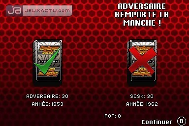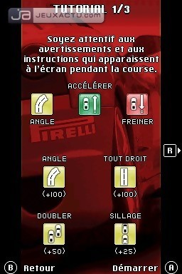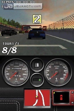 Le gameplay de Ferrari Challenge autorise une prise en main immédiate, et ne nécessite pas un sens aiguë du pilotage. La seule difficulté réside dans le fait de jeter de temps en temps un coup d'oeil sur l'écran du bas pour anticiper les virages, c'est tout. La vue par défaut - subjective - demeure suffisamment claire pour appréhender le relief des huit circuits. En Versus, il est possible de jouer en single card comme il est de rigueur sur DS, pour des courses jusqu'à quatre joueurs. On termine le tour du propriétaire par le mode Challenge Cards, un jeu de cartes dans lequel il va falloir récupérer toutes celles de son adversaire. Le concept est on ne peut plus simple : chaque joueur tire une carte sur laquelle est représentée un modèle de véhicule, ainsi que ses caractéristiques techniques. Le joueur qui a la main doit désigner l'une d'elles - année de fabrication, moteur, prix... -, et c'est celui qui possède la plus grande valeur qui remporte la carte du joueur d’en face. Si le prix est le critère sélectionné par exemple, celui qui possède la voiture la plus chère remporte la mise. C'est en gagnant les différents défis proposés dans Ferrari Challenge que l'on pourra gonfler son paquet de cartes. L'ambiance sonore du jeu est médiocre, avec des Ferrari qui miaulent au lieu de rugir. Même les voix-off sont au bout du rouleau, sans oublier les thèmes musicaux qui deviennent rapidement répétitifs. La réalisation ne verse pas non plus dans l'excellence, même s'il faut garder à l'esprit que l'on est sur DS. Du coup, le car design s'avère très moyen, de même que les environnements qui ressemblent parfois à un amas de pixels. Les tracés ont du relief - c'est déjà ça -, s'inspirent même des originaux, mais les courbes manquent de rondeur et arborent des angles droits peu séduisants.