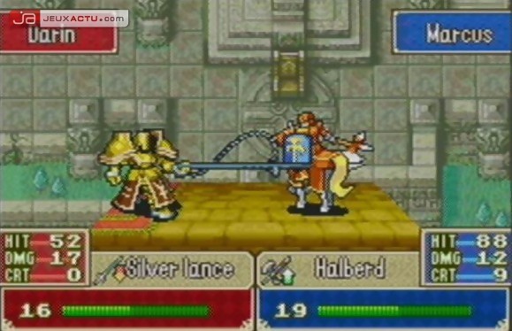 C’est donc maintenant qu’on se lâche dans les superlatifs : Fire Emblem est génial, il possède une richesse de jeu impressionnante (qui égale en fait Final Fantasy Tactics), et des graphismes super trognon comme dans Advance Wars. A chaque combat, on a droit à une jolie petite animation qui vous montrera plus en détails à quoi ressemblent vos combattants, et certains d’entre eux ont vraiment la classe ultime. On retiendra surtout les magies, superbes, Lyn et son épée Mani Katti qui fait des ravages, les cavaliers, les pégases, tout est vraiment bien animé et joliment dessiné. De la belle 2D comme en voit plus que sur GBA.