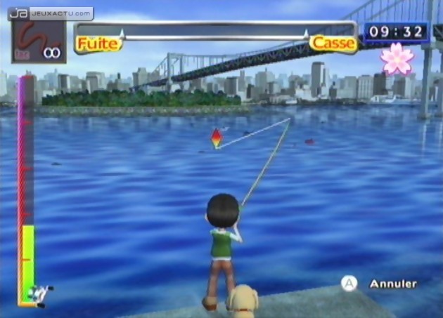 Ce n’est un scoop pour personne, les simulations de pêche sont assez barbantes, surtout quand il faut patienter des heures durant avant qu’un poisson ne vienne accrocher l’hameçon. Conscient de cet handicap, Hudson Soft a décidé de ne pas opter pour la simulation, plus réaliste certes mais moins efficace, surtout quand il s’agit de séduire un public large où la prise de gros se doit être quasi immédiate. Ce n’est donc pas un hasard si le temps et les saisons sont accélérés dans le jeu. Car il faut bien avouer que pour parcourir l’ensemble du littoral japonais, il va falloir faire preuve d’endurance et d’abnégation. En effet, hormis un compagnon canin, au choix en début de carrière, les promenades ne seront guère bavardes. Mais là ne réside pas l’intérêt du jeu, l’objectif étant d’attraper un maximum de poissons, si possible avec un choix le plus varié afin de remplir son catalogue et se targuer de devenir le pêcheur le plus en vogue de l’archipel nippon. Il s’agit du carnet de pêche où il est possible de cataloguer pas moins de 100 espèces de poissons différents ; rien de plus. Evidemment, l’intérêt devient subitement limité, et tous ceux qui espéraient varier les plaisirs risquent de déchanter. Fort heureusement, pour combler ce vide, la jouabilité proposée dans Fishing Master se montre beaucoup plus intéressante que les autres jeux de pêche. Après un rapide tutorial, on prend le pli assez rapidement et réaliser les gestes de la véritable pêche devant son écran devrait ravir tous ceux qui ne peuvent partir sur les bords de mer les week-end de Pâques. Alors que certains titres pêchent par leur manque d’ergonomie et une reconnaissance des mouvements hasardeuse, voire même parfois absente, Fishing Master se manie avec une assez belle précision, ce qui mérite d’être souligné. Dommage que les gestes, malgré une certaine subtilité, se limitent à quelques lancers et du moulinage pour ramener sa proie. Car soyons honnêtes, on a fait rapidement le tour de la question au bout de quelques parties. On pourrait alors compter sur la réalisation pour faire passer la pilule mais rien à faire, Fishing Master fait partie de ces petits jeux, développés en quelques mois et qui rappellent que la Wii continuera à faire dans le minimum syndical, tant que le grand public n’aura pas une certaine exigence.