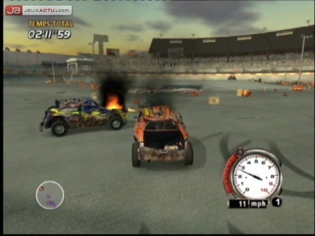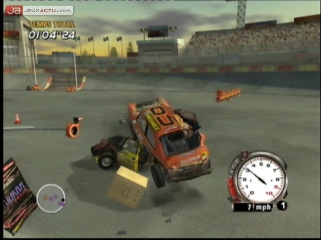 Exit les voitures classieuses et les grandes marques automobiles, un coup de peinture à la va vite sur ce qui peut faire office de véhicule et vous voilà parti. Ne vous embarrassez pas de néons et autres gadgets esthétiques, votre voiture ne va pas rester longtemps en l’état, le contraire eut été dommage. Confortablement assis (mais pas forcément pour longtemps) vous voilà donc parti à bord de votre engin, à arpenter des circuits improvisés en forêt, sur des chantiers de construction, des terrains gelés ou encore un village qui n’est pas sans faire penser à celui des Duke of Hazzard. Vous pourrez même faire quelques ‘pauses’ entre deux sur de vrais circuits pour faire cracher votre moteur dans de meilleures conditions. A l’exception de ce dernier type de parcours, ce n’est pas la vitesse pure qui vous permettra de gagner, mais votre gestion des trajectoires et la bonne utilisation des objets environnants. A l’instar de Burnout 3, chaque véhicule de FlatOut dispose en effet d’une jauge de nitro qui se remplira avec une conduite dangereuse. Ainsi, chaque heurt avec vos concurrents, mais surtout chaque destruction ou déplacements des éléments du décor vous rapportera le précieux NO2 avec un seul mot d’ordre, plus y’a de dégâts, plus vite elle se remplira. Les courses étant en permanence extrêmement serrées, et le turbo s’écoulant en une poignée de secondes, vous serez donc amené à reproduire constamment vos actes de démolition. Le jeu est alors extrêmement tourné vers les collisions et on le comprend, les développeurs sont fiers de leur choix de moteur physique et comptent bien nous le faire voir. A vous donc de forcer le passage pour être le premier à