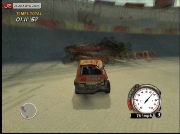 détruire les pyramides de tonneaux ou les panneaux publicitaires jonchant les bords des circuits. Attention toutefois, non seulement votre voiture est victime de la même physique (pare chocs, portières, capot et autres pièces se détacheront en fonction de vos exploits), mais tout ce qui fera office de défouloir pour votre folie destructrice restera sur le passage comme autant d’obstacles à éviter au tour suivant. Les tonneaux joyeusement renversés rouleront alors sur la piste et en prendre sous une roue à pleine vitesse pourra vous faire prendre un envol inattendu vous faisant perdre de précieuses secondes. Pour peu que cela vous arrive à quelques virages de l’arrivée et c’est le drame. Vous aurez beau être premier pendant quatre tours en croyant distancer vos adversaires, ils ne seront jamais bien loin et la moindre erreur sur la fin vous sera fatale. Le système d’handicap du jeu veut en effet que vous soyez toujours au cœur de la course, à proximité des concurrents, mais quelle frustration de se voir doublé par trois véhicules en même temps à 50 mètres de l’arrivée après avoir incroyablement dominé l’ensemble de l’épreuve. Heureusement, si l’handicap est poussé trop loin dans les premiers niveaux (mode bronze), il semble s’atténuer au fur et à mesure du jeu, jusqu’à enfin pouvoir distancer un minimum les concurrents pour peu que vous ayez pris soin de booster votre véhicule.