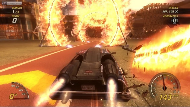 Pour ce qui est du fondement même du jeu, FlatOut : Ultimate Carnage conserve en tout point ce qui a fait le succès de la série depuis 2004. A commencer par une conduite très arcade que les joueurs de FlatOut 2 reconnaîtront dès les premiers tapotements de boutons. Comme d’habitude, le suspense d’une course réside dans un bonne utilisation du boost que vous remplirez en détruisant un maximum d’objets, en éclatant les bagnoles de vos adversaires ou en effectuant des sauts de tarés. Plus vous y allez franco, plus vous remplirez votre réservoir de nitro. Ce bonus en course est très important lorsqu’on sait que les adversaires sont plus finauds qu’il n’y paraît. Désormais 12 sur la grille de départ, ils ont chacun leur personnalité et leur habitude de jeu. Certains ne sont là que pour gagner tandis que d’autres préfèrent vous rentrer dans le lard. Ce qui signifie donc que selon le type de courses, le classement changera du tout au tout. Le Mode FlatOut ou Carrière se découpe en trois épreuves bien distinctes, Derby, Courses et Rues, ponctuées d’arènes et d’une douzaine de cascades où il faudra balancer son pilote dans le décor pour réaliser un high-score. Si les premières parties semblent difficiles et manquent de rythme, en passant par la case Atelier vous pourrez acheter divers accessoires automobiles pour améliorer les compétences de votre véhicule. Accélération, poids, vitesse max, résistance, comportement, chaque statistique évoluera en fonction de vos achats. Vous devrez donc bien choisir vos améliorations car certaines diminuent des caractéristiques. Mais pour arriver à personnaliser au maximum votre voiture, il va falloir faire vos preuves sur le terrain. En plus d’être rémunéré en fonction de votre classement, certains bonus mettront du beurre dans les épinards. FlatOut : Ultimate Carnage vous encourage à être le plus rapide, le plus destructeur ou le maître des explosions. Ainsi, au fur et à mesure de vos victoires et de vos exploits, vous accéderez à de nouvelles catégories de véhicules et à des tournois supplémentaires. Hélas, si les circuits de FlatOut 2 tournaient vite en boucle, il en est malheureusement de même pour cette version Xbox 360. Bugbear Entertainment n’a pas pris le soin de nous en concocter des nouveaux et c’est d’autant plus dommage pour les cascades que l’on connaît par cœur depuis 2006.