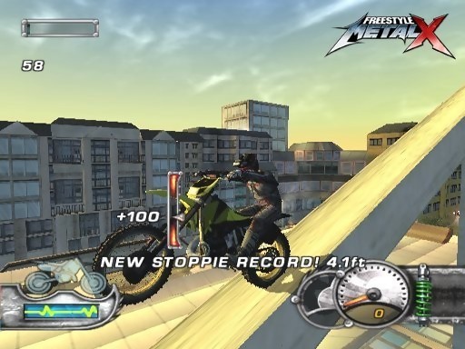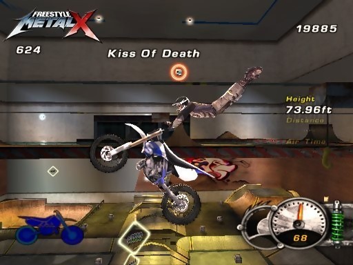 Pour tous ceux qui auront échappé à la vague Jackass, sachez que ce cher Johnny est l’un des protagonistes d’une merveilleuse émission américaine. Son but : tenter des challenges aussi périlleux que stupides. Si j’évoque cette série, c’est bien évidemment parce que Freestyle Metal X s’en inspire quant à l’ambiance. Rassurons les âmes sensibles dans l’assistance, il ne sera nullement question de sniffer des vers de terre, de frapper son paternel ou encore de faire la cible humaine à des novices du paintball. Ici, tous les challenges concernent vos aptitudes de pilote dans des situations cocasses et des endroits extravagants. Freestyle Metal X n’est pas avare en dépaysement car le jeu propose 12 niveaux, qu’il faudra débloquer au fur et à mesure. Pour en citer quelques-uns et pour annoncer la couleur, vous visiterez Heavy Metal, Snow Stormer, Downtown Destruction ou bien Skull Valley. Loufoques et immenses, les niveaux fourmillent de passages différents où liberté est le maître mot. Rien ne vous résiste, la moindre bosse ou dénivellation est sujette à un saut majestueusement acrobatique pour atterrir sur le toit d’un bâtiment ou tout simplement dans une zone qui vous est totalement inconnue. Freestyle Metal X joue énormément sur cette profondeur qui n’est pas sans rappeler cette bonne vieille série des Motocross Madness. Mais revenons à nos moutons : la jackass-attitude. Vous vous en doutez sûrement, l’ami Tony Hawk rôde dans les parages à la vue du titre de ce paragraphe. Effectivement le produit star de Neversoft a laissé sa marque de fabrique et chacun l’exploite à sa guise. Dans le cas de Freestyle Metal X, c’est au niveau du Mode Carrière que cela se ressent. On gère l’évolution professionnelle d’un pilote en réalisant divers challenges, en empochant de l’argent et en développant sa bécane. Au menu, vous allez évidemment devoir faire des scores max, des gaps et autres figures peu originales. Rien de bien exaltant à première vue. Maintenant intégrez à ces challenges primaires un ranch à taureaux, une dizaine de camions alignés, une meute de loups, des pilotes en herbes ou un trafic urbain. Là tout de suite, le cerveau palpite de plaisir. Excellent mélange entre originalité et difficulté croissante, Freestyle Metal X propose en outre des modes comme Fléchettes Humaines. Pour faire simple, chevauchant votre bécane vous devez vous jeter dans un cratère afin de faire un maximum de points. Seul problème, celui est plutôt loin et il va falloir éviter les mines qui se baladent librement sur la map tout en amassant les bonus, eux aussi aléatoirement placés. Comme quoi Freestyle Metal X n’aura jamais été aussi proche de Jackass.La main du créateur