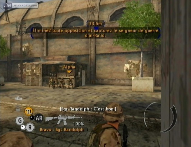 Maintenant que les déplacements des équipes Alpha et Bravo vous sont familiers, on passe aux séquences de tirs qui bénéficient de quelques nouveautés. Si d’accoutumée, le réticule de visée (X) permet soit d’enclencher un tir de couverture, soit de lancer une grenade à fragmentation ou encore de balancer des fumigènes, désormais il est possible le temps d’un instant de viser avec précision les ennemis avec un seul soldat. Que vous préfériez le mitrailleur, le grenadier, le fusilier ou simplement le chef d’équipe, vous pouvez en maintenant R enfoncé basculer en affichage FPS avec pour seule indication le viseur. Selon votre choix, vous pourrez détruire facilement des stocks de munitions, indiquer une cible pour une frappe aérienne ou tout simplement éliminer un moudjahiddine bien planqué. Cependant, pour éviter une certaine facilité de jeu, lorsque vous avez verrouillé votre cible, la mire à l’écran change de couleur et affiche un point rouge qui fera mouche si vous appuyez sur A. Il faut donc être patient pour réussir son coup mais le revers de la médaille, c’est que votre soldat est exposé aux tirs hostiles malgré le canardage de ses collègues. Vous pensiez vraiment avoir le beurre, l’argent du beurre et… et c’est déjà pas mal ! Parmi les quelques, et rares, nouveautés de Full Spectrum Warrior : Ten Hammers, on note l’apparition de véhicules, à savoir les Bradleys, ces fameux blindés américains, qui se contrôlent de la même manière que vos soldats. Le bouton X servant arroser une zone grâce à la mitrailleuse installée sur le toit du véhicule tandis que le R permet de tirer en utilisant le canon principal et d’autant plus destructeur qu’il est long à recharger. Avec ce collectif, vous avez de quoi planifier vos attaques via des manœuvres de contournement (pour prendre les ennemis à revers pendant qu’une équipe fait diversion avec un tir de couverture) principale technique de jeu de la série. Vous pouvez même vous amuser à scinder chaque formation en deux groupes de deux combattants pour doubler ou quadrupler vos interventions. Bien évidemment, à être moins nombreux, les soldats sont beaucoup plus vulnérables. Et si par malheur, vous perdez un de vos gars sur le champ de bataille, vous avez toujours le moyen de venir à sa rescousse et de le transporter jusqu’à un bâtiment ou une antenne médicale. Dans ce cas-là, un militaire se dévoue en rangeant son armada pour porter le mutilé jusqu’à bon port. Même dans le tragique, il faut avoir des nerfs d’acier et une bonne dose de sang pour gérer les unités au sol Alpha et Bravo, et les forces blindées Charlie et Delta.