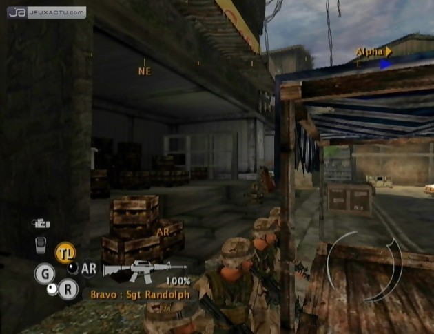 Mais avant de crier sur tous les toits que la guerre est l’avenir de l’homme, un petit débriefing s’impose concernant la série Full Spectrum Warrior. A la différence des autres jeux de guerre, ici vous ne contrôler à aucun moment du jeu un personnage. Vous gérez une escouade de 4 soldats prêts à tout pour réduire à néant les moudjahiddines du Zékistan, pays imaginaire assez proche dans son architecture de certaines contrées du Moyen-Orient avec tous les clichés qui vont bien. Qui a parlé d’Irak ? C’est donc en général d’armée que vous allez gérer tout ce beau monde dans les ruelles étroites balayées par un soleil généreux et quelques bourrasques chargées de sable. Et pour déplacer vos troupes, Full Spectrum Warrior s’inspire des jeux de stratégie PC à la différence qu’ici, vous ne contrôlez pas les mouvements de vos soldats via la souris mais avec un curseur géré par le stick analogique gauche. Ce dernier permet, outre le fait de déplacer vos hommes comme bon vous semble, de mettre en marche une stratégie offensive ou certains replis défensifs. Car comme dans tout bon jeu où ça canarde, il faut être le moins possible exposé aux tirs ennemis surtout que les conséquences peuvent être très lourdes dans Full Spectrum Warrior : Ten Hammers. A la manière des jeux de tirs dits "réalistes", vous n’avez pas 150 points de vie, une régénération automatique de votre santé ou des médikits disponibles sur le cadavre des ennemis. Il suffit d’une balle pour vous renvoyer dans votre pays natal, confortablement installé dans un cercueil de fortune. Alors pour éviter que ça sente le sapin, vous devrez protéger vos hommes du mieux possible en vous servant des décors comme protection. Les angles de murs, les murets, les caisses de ravitaillement ou les ruines sont bien pratiques pour se mettre à couvert lorsque la situation vous échappe. Attention cependant aux objets destructibles tels que les voitures ou les étalages qui peuvent éclater sous le feu nourri des ennemis. Ainsi chemin faisant, on découvre ô combien Full Spectrum Warrior : Ten Hammers n’est pas un jeu bourrin mais bel et bien une simulation pour les stratèges militaires. Pour ce nouveau volet, les développeurs de Pandemic Studios ont pensé à intégrer une aide à l’écran qui vous permet de visualiser avec précision la formation adaptée lorsque vous entrez en contact avec un élément environnant. Bien pratique, il faut l’avouer.