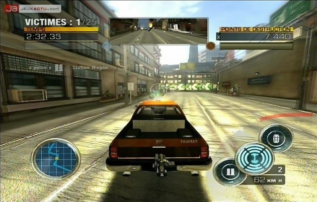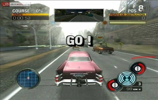 Mais avant de s’attaquer à la forme de ce Full Auto, il faut savoir à quoi s’en tenir. La course, bien qu’omniprésente dans le jeu, n’est en réalité qu’un prétexte pour assouvir sa passion destructrice. Pour devenir un seigneur de guerre sur bitume, vous devrez vous familiariser avec les différents challenges proposés. Au nombre de 5, on pourrait croire qu’ils sont différents les uns des autres mais que ni ni, la faute à des objectifs de mission pour le moins répétitifs. En mode carrière, vous devrez à la fois combiner un score élevé en destruction et finir dans les trois premiers pour espérer progresser dans le jeu, et ce pour les défis Aller-Retour, Point-à-Point, Circuit et Elimination Directe. Pas besoin d’être génie en mathématiques pour comprendre qu’un seul challenge diffère des quatre énumérations précédentes. Intitulé Saccage, il laisse de côté la course et se concentre uniquement sur votre high score durant le temps qui vous est imparti. Exploser, broyer, détruire, ébrécher, sulfater, grenader ou pulvériser, tous les moyens sont bons pour faire grimper votre taux de destruction. Après avoir choisi parmi la vingtaine de voitures proposées (4x4, dépanneuse, limousine, Cadillac, Muscle, Hotrod, Dodge …), vous pourrez configurer l’artillerie de votre engin de malheur parmi une liste assez restreinte d’armes. Chaque véhicule possède deux emplacements à savoir un à l’avant et l’autre à l’arrière. Par conséquent, vous sélectionnerez deux armes. Cependant le choix s’avère quelque peu frustrant du fait de proposer des duos indissociables. Impossible donc de modifier son attirail selon ses préférences afin de mieux coller avec les besoins de la course. C’est pourquoi, à titre d’exemple, il faudra se coltiner avec les missiles l’écran de fumée arrière tout bonnement inefficace contre ses concurrents alors que les mitraillettes, moins puissantes certes, proposeront des mines de proximité à la puissance de feu élevée. Il faudra parfois serrer la ceinture et se faire violence car une pétoire frontale à la portée longue ne bénéficie pas d’une arme arrière exceptionnelle. De ce fait, le choix du véhicule devient plus important qu’il n’y paraît. Et jeter un coup d’œil au caractéristiques de son bolide ne sera pas un luxe et évitera les déconvenues une fois sur le bitume.