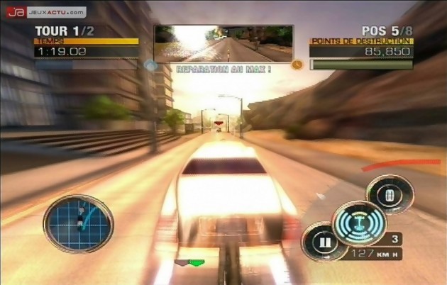 La puissance de la Xbox 360 n’est ici pas suffisamment exploitée pour nous décoller la rétine comme on a pu voir précédemment. La réalisation graphique générale nous convainc tout juste pour un jeu next gen’ et ce ne sont pas les effets de blurs et les ralentis façon Burnout ou Need For Speed qui vont nous leurrer. La faute donc à ces satanés ralentissements mais aussi à un léger clipping et à quelques freezes intempestifs. Dommage car à côté de ça, on a affaire à des débauches d’effets pyrotechniques somptueux lors des explosions. Flammes, fumée et chaleur n’ont jamais été aussi crédibles dans un jeu de bagnoles. Qu’elles soient visuelles ou sonores, les détonations font honneur à ce genre de jeu surtout pour tous ceux qui possèdent une installation home-cinema et qui pourront ainsi jouir des impacts de balles provenant des adversaires à leurs fesses. Puisqu’on dissèque l’aspect sonore du jeu, évoquons rapidement la track-list electro de Full Auto. Sans être mauvaise, elle est beaucoup trop répétitive pour marquer les esprits et un chouilla bordélique peut-être afin de mieux coller avec l’aspect général du titre, aspect que l’on retrouve également en mode multijoueur en écran splitté ou sur Xbox Live. D’ailleurs, les parties sur le réseau ne souffrent quasiment pas de lags et leurs recherches est assez rapides, chose rare sur le service de jeu en ligne de Microsoft. En contrepartie, on regrettera l’absence de l’option Réparation bien pratique pour les plus fins stratèges de Full Auto.