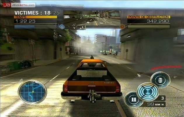 Mais avant de s’attaquer à la forme de ce Full Auto, il faut savoir à quoi s’en tenir. La course, bien qu’omniprésente dans le jeu, n’est en réalité qu’un prétexte pour assouvir sa passion destructrice. Pour devenir un seigneur de guerre sur bitume, vous devrez vous familiariser avec les différents challenges proposés. Au nombre de 5, on pourrait croire qu’ils sont différents les uns des autres mais que ni ni, la faute à des objectifs de mission pour le moins répétitifs. En mode carrière, vous devrez à la fois combiner un score élevé en destruction et finir dans les trois premiers pour espérer progresser dans le jeu, et ce pour les défis Aller-Retour, Point-à-Point, Circuit et Elimination Directe. Pas besoin d’être génie en mathématiques pour comprendre qu’un seul challenge diffère des quatre énumérations précédentes. Intitulé Saccage, il laisse de côté la course et se concentre uniquement sur votre high score durant le temps qui vous est imparti. Exploser, broyer, détruire, ébrécher, sulfater, grenader ou pulvériser, tous les moyens sont bons pour faire grimper votre taux de destruction. Après avoir choisi parmi la vingtaine de voitures proposées (4x4, dépanneuse, limousine, Cadillac, Muscle, Hotrod, Dodge …), vous pourrez configurer l’artillerie de votre engin de malheur parmi une liste assez restreinte d’armes. Chaque véhicule possède deux emplacements à savoir un à l’avant et l’autre à l’arrière. Par conséquent, vous sélectionnerez deux armes. Cependant le choix s’avère quelque peu frustrant du fait de proposer des duos indissociables. Impossible donc de modifier son attirail selon ses préférences afin de mieux coller avec les besoins de la course. C’est pourquoi, à titre d’exemple, il faudra se coltiner avec les missiles l’écran de fumée arrière tout bonnement inefficace contre ses concurrents alors que les mitraillettes, moins puissantes certes, proposeront des mines de proximité à la puissance de feu élevée. Il faudra parfois serrer la ceinture et se faire violence car une pétoire frontale à la portée longue ne bénéficie pas d’une arme arrière exceptionnelle. De ce fait, le choix du véhicule devient plus important qu’il n’y paraît. Et jeter un coup d’œil au caractéristiques de son bolide ne sera pas un luxe et évitera les déconvenues une fois sur le bitume.