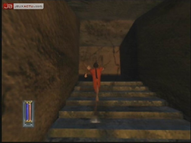 Prévu à l’origine sur la dernière console de Sega, Galleon ne semble pas avoir évolué d’un iota depuis cette époque. Les graphismes sont vilains, n’ayons pas peur des mots, et offrent des textures fadasses, plates et à la limite du flou. Rhama a beau être capable d’escalader un certain type de roche, on arrive à peine à distinguer les différentes parois tellement on se flingue les yeux à discerner quoi que ce soit. Bien sûr, ce n’est pas systématique, mais c’est fatigant. Ensuite, ça manque furieusement de détails. Tout est lisse, plat et anguleux comme sur PlayStation. La 1, pas la 2. Le jeu propose également un manque de finition aberrant en 2004. Tout le côté technique laisse donc franchement à désirer (mis à part les vois françaises, excellentes), mais c’est aussi la manière dont est racontée l’histoire, le manque de punch des cinématiques, voire l’absence de cinématiques lors de moments clés. Certains passages (trop ?) sont par exemple chronométrés : en cas de réussite, tout va bien, les événements s’enchaînent. Mais en cas d’échec, lorsque l’horloge atteint le zéro, paf, écran noir suivi d’un écran de chargement. Et vous revoilà propulsé au début de l’épreuve. On ne sait même pas ce qui passe, le jeu s’arrête, point barre. Rien de tel pour casser l’ambiance. Alors que le jeu est en développement depuis des années, il accuse de vrais défauts de jeunesse assez consternants.