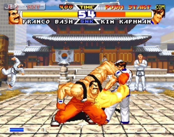 Forcément, pour s’adapter à ces nouveaux éléments, SNK en a profité pour revoir les mécanismes du système de combat. Dehors les combinaisons low punch / strong punch et low kick / strong kick, la touche A est désormais assimilée aux coups de poing, le bouton B retranscrits les attaques aux pieds, la touche C correspond aux grosses frappes (et varient en fonction du personnage choisi) et le bouton D sert désormais à se déplacer entre les trois plans de combat, mais aussi à se retourner pendant un saut, ce qui permet d’attaquer de front son adversaire en plein vol, une technique fourbe que Iori Yagami possède dans sa panoplie d’attaque d’ailleurs. Il fallait y penser. Un peu déroutante de prime abord, cette jouabilité inédite a prouvé depuis plusieurs années maintenant son efficacité étonnante. A croire que SNK avait trouvé la formule magique. Pour en revenir aux inspirations concédées par Virtua Fighter, Real Bout Fatal Fury se permettait aussi d’utiliser le même système de combos, basé sur une combinaison de touches et non plus en réalisant plusieurs attaques spéciales. Il s’agissait d’une première à l’époque pour un jeu de baston 2D, tout comme cette astuce qui permettait d’achever son adversaire au sol. Tout bonnement exaltant. Bref, pour contrer l’arrivée en masse des jeux de baston 3D et faire perdurer le noble art, SNK avait bien compris qu’il fallait regarder autour de soi… Pas bête !