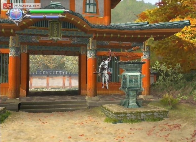 Nonobstant une mise en scène ringarde et une durée de vie rachitique, Genji dispose en contrepartie de deux aspects majeurs à souligner. Le premier, c’est sa réalisation tout simplement splendide. Des montagnes à la végétation incroyablement généreuse, en passant par les chemins d’une rue commerçante jonchée de vie et de pétales de cerisiers, jusqu’aux jardins impériaux dont l’architecture splendide se mêle aux reflets naturels des étangs couleur mordoré, Genji est un régal esthétique constant, et le joueur poète et raffiné de s’extasier : "Putain, c’est beau le Japon ancien !". Un festival visuel particulièrement homogène, puisque sur la dizaine de lieux que vous serez amenés à visiter, les graphistes de Game Republic ne vous laisseront à aucun moment l’occasion de critiquer la moindre éventuelle faute de goût. Genji est esthétiquement irréprochable, un léger aliasing (NDMaxime : je dirais plutôt "prononcé") mis à part, et on n’ose imaginer ce qui nous attend dans quelques petites années pour la suite de l’aventure sur la prochaine génération de PlayStation. A côté de ce ravissement visuel, la bande son paraît un peu moins irréprochable, bien qu’elle s’accouple délicatement à vos péripéties. Ceux qui sont déjà passés par Onimusha et autres Otogi ne seront cependant plus vraiment surpris par ce genre d’ambiance faite d’instruments traditionnels mêlés à des sonorités tantôt vocales, tantôt saturées par des nappes stridentes et maléfiques. Efficace, sans plus. Mais une bonne réalisation ne justifie pas le statut de "must have" et Genji se devait de rompre la monotonie de sa mise en scène et de son déroulement à l’aide de quelque chose de neuf, dans le système de combat par exemple. C’est chose faite, et pour peu que vous aimiez les notions de contre-attaque et de timing, vous allez jubiler en jouant à Genji.